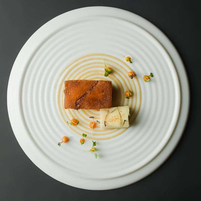 Merluza en 3 pases: tartaleta, taco de merluza y carrillera