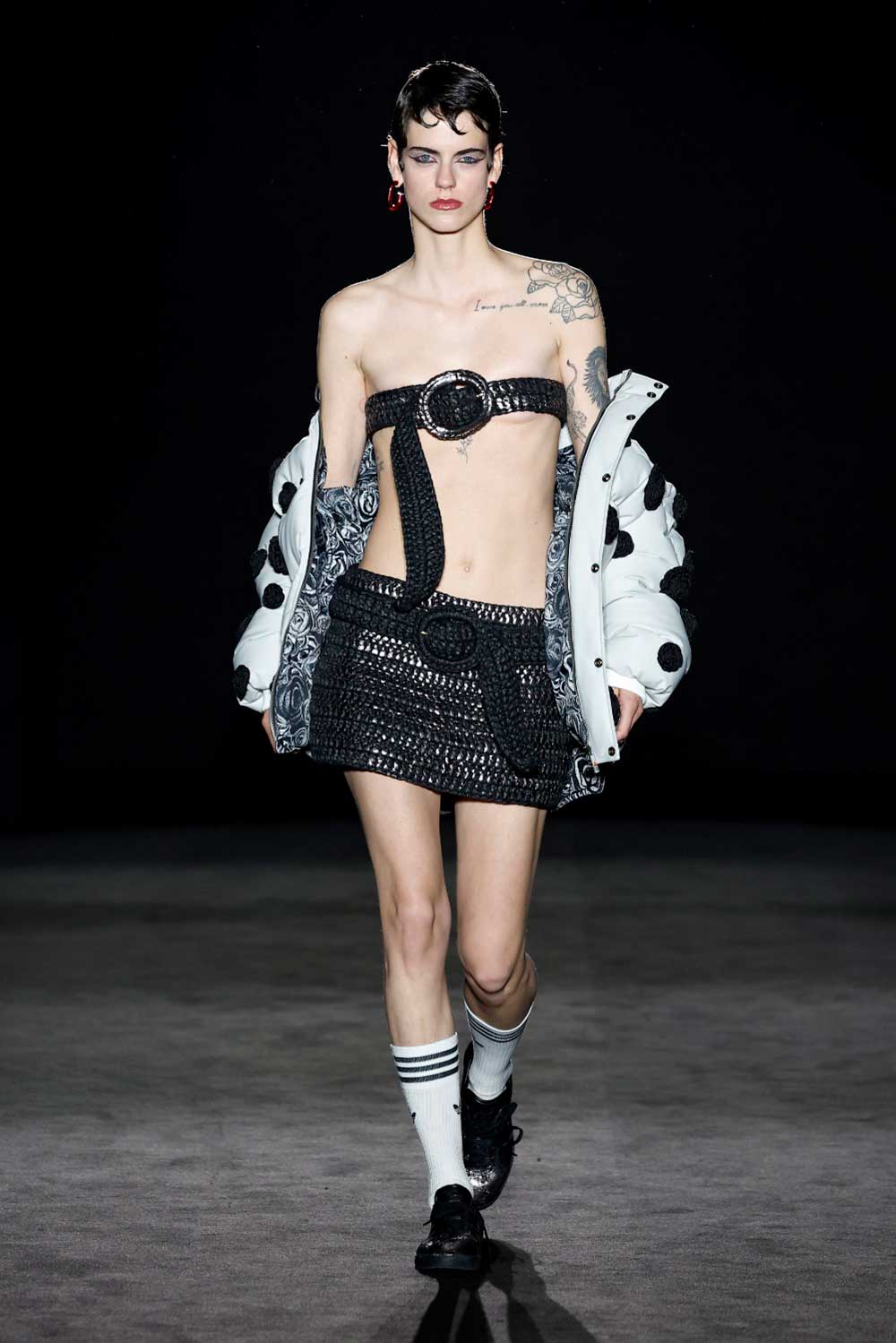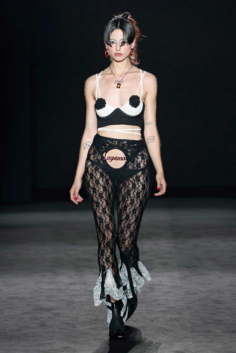 Por primera vez, 404 Studio pisa la pasarela de 080 Barcelona Fashion. Una marca con fuerte base nacional e internacional, se da a conocer en la ciudad condal. No me quedan lágrimas, es la colección que Anais Vauxcelles que mediante cristales Swarovski o los plumas míticos de Pedro Gómez Madrid, representa cómo eran las tribus quinquis de la España de la transición. En el desfile hemos podido ver su famosa técnica crochet en una versión de un vestido de flamenca o dos piezas de top con falda. Si quieres adentrarte más en la historia, tienes que ver películas míticas de Eloy de la Iglesia.