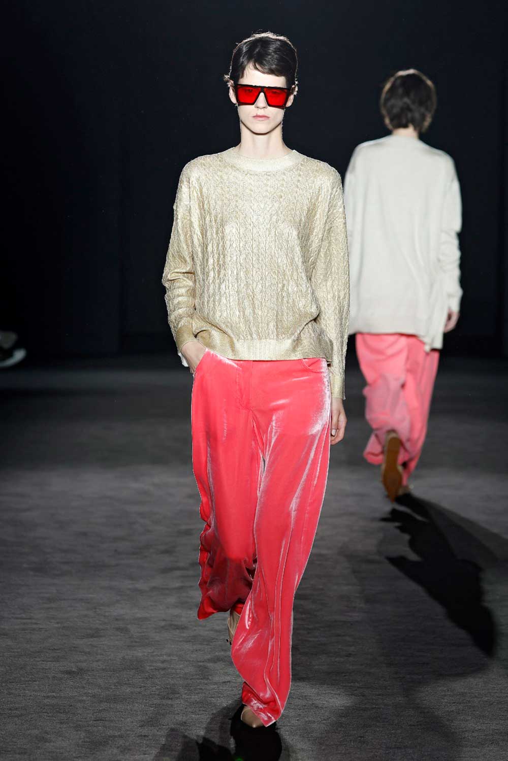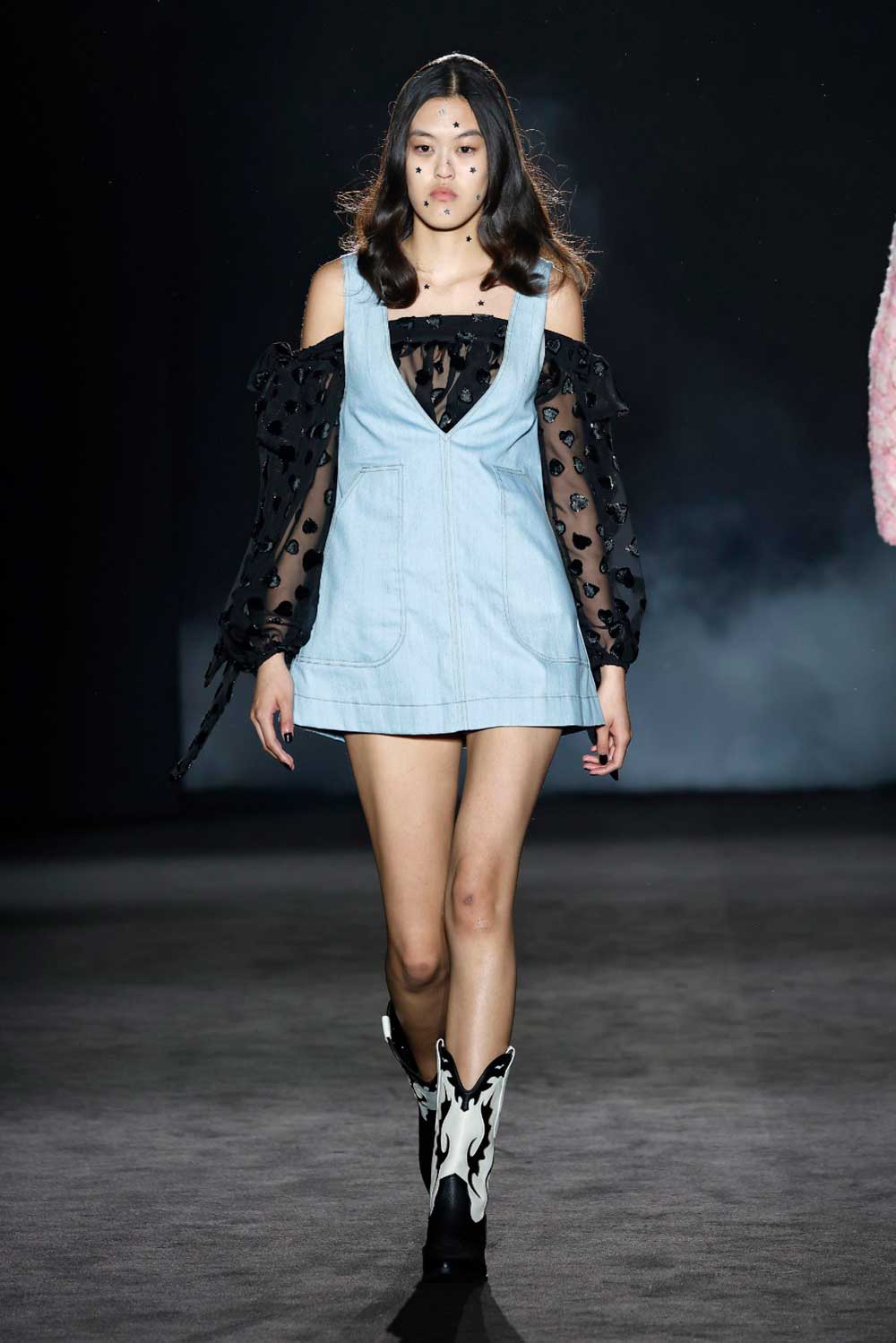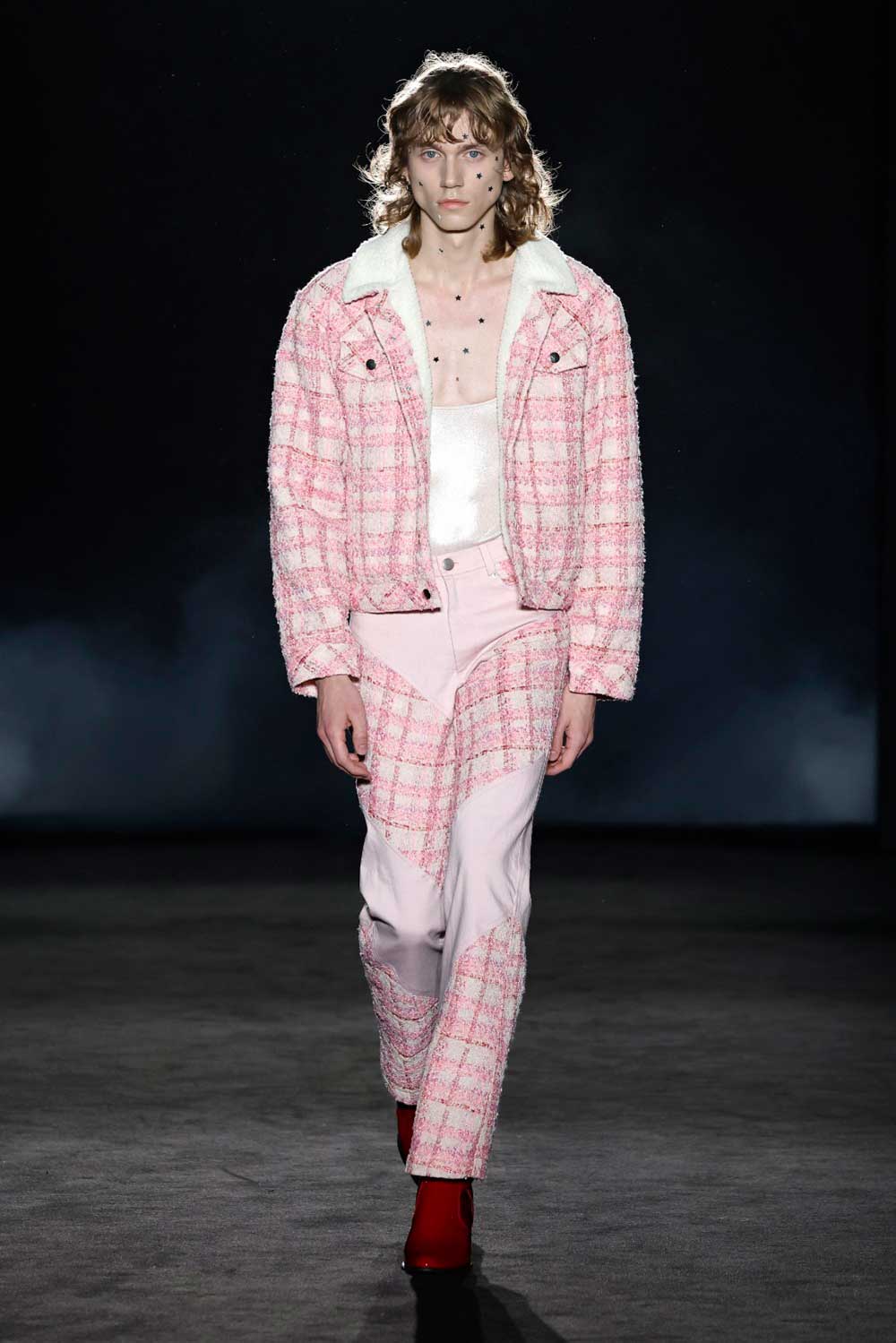 El joven diseñador tiene como punto inicial la década de los 70 en Hollywood, más concretamente, en esa lucha de egos y el poco espacio para muchos actores o cantantes. Una propuesta que define con el título “The American Dream”. Y en ella vemos mucho tejido cowboy, con abundancia de denim, tweed, sedas y tules, tanto en las siluetas aparentemente más femeninas, como en las masculinas.