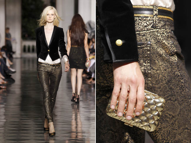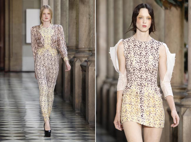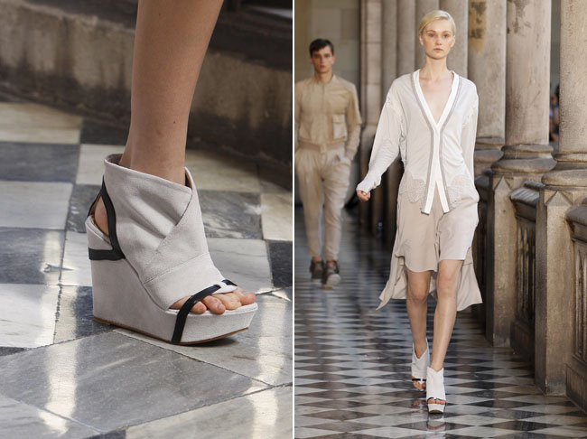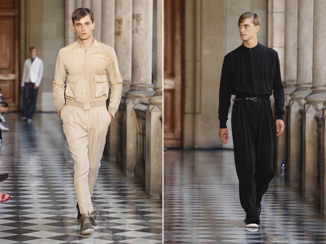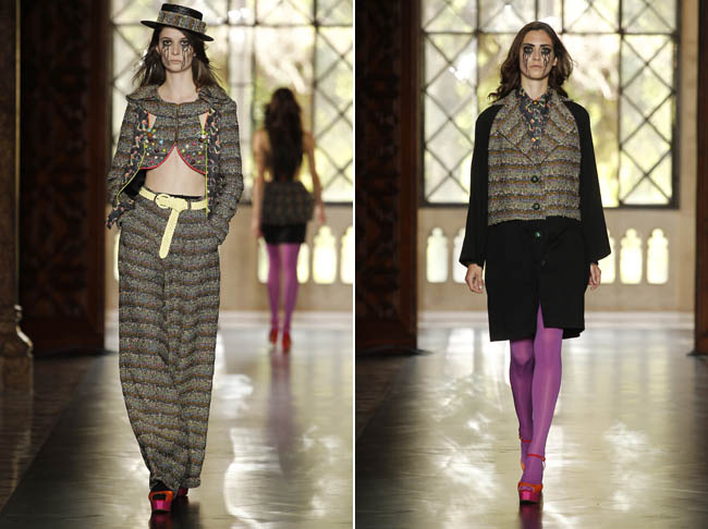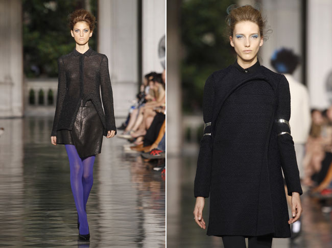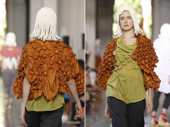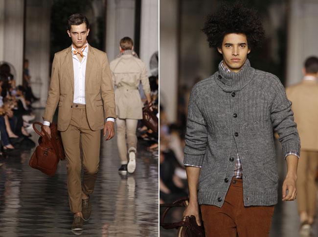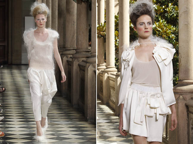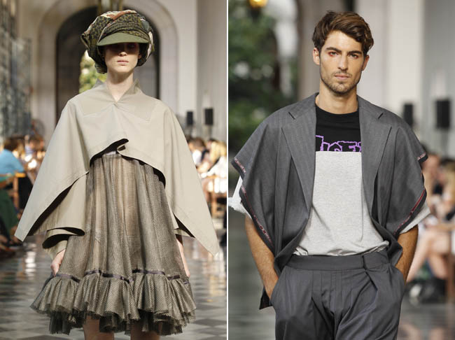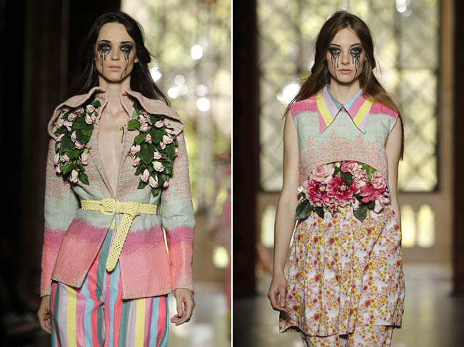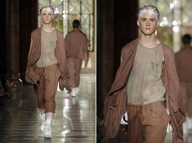 Josep Abril: El también director creativo de la línea masculina de Armand Basi, presentó una colección de hombre que pretendía hablar de su personal proceso creativo, casi autobiográfico que se verbalizaba así en la nota de prensa: “Conduces la pasión, la rabia o el aburrimiento para dejar un rastro: para crear dejas, sobre una prenda de ropa, pedacitos de vida, de historias”. Personalmente, considero que las ideas menos conceptuales del desfile eran las más acertadas: las combinaciones cromáticas (negro y glicina), las prendas a rayas (en 2 suaves tonos de glicina, tan sutiles que difícilmente se aprecian en las fotos) y las americanas más favorecedoras, las que cubren caderas y posaderas.