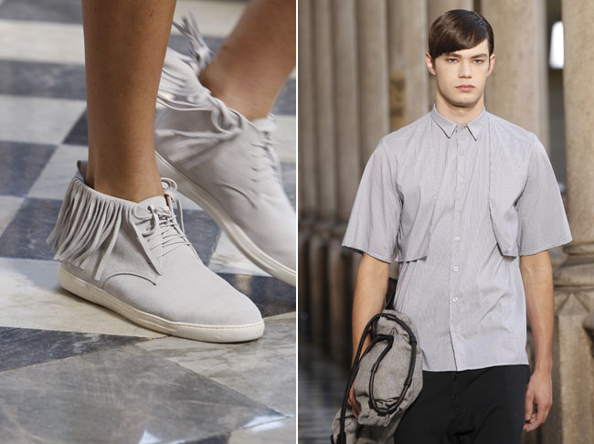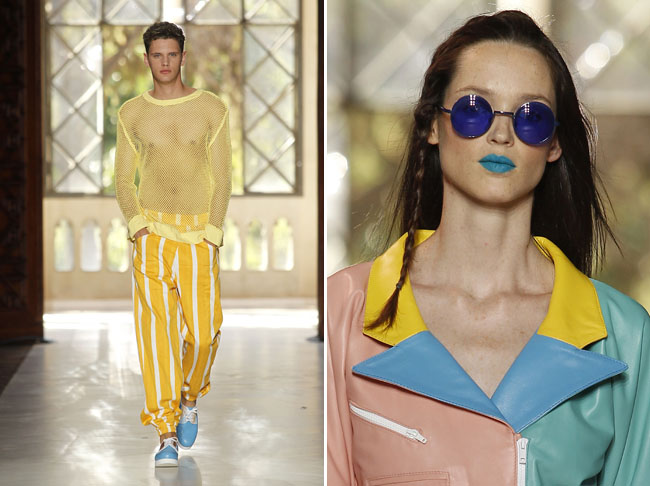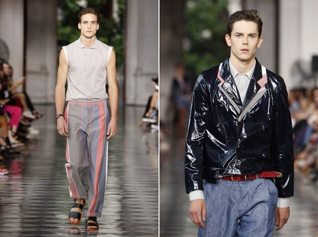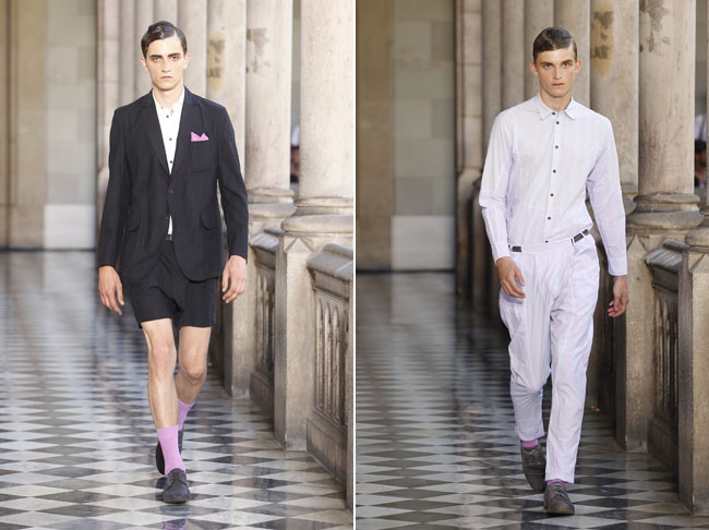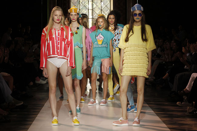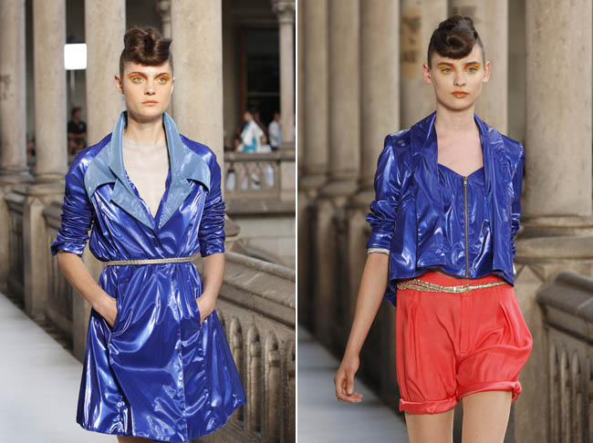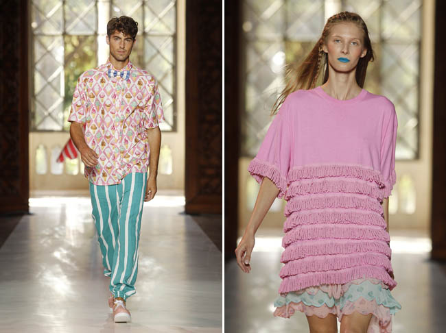 Krizia Robustella: La doble ganadora de la edición de invierno de 080, presenta, como en ocasiones anteriores, una colección juvenil para ambos sexos. Poco dada a divagaciones y subjetividades intelectuales, Krizia ha elegido el mundo de las heladerías como tema para la primavera verano 2012. Una colección simpática con muchas rayas y flecos que parecían recién recortados de un toldo veraniego, la típica carta de helados a modo de estampado… y el naif descaro de Krizia. Echamos de menos un Cornetto de Frigo durante el desfile, era el desfile perfecto para un esponsor de tal naturaleza.