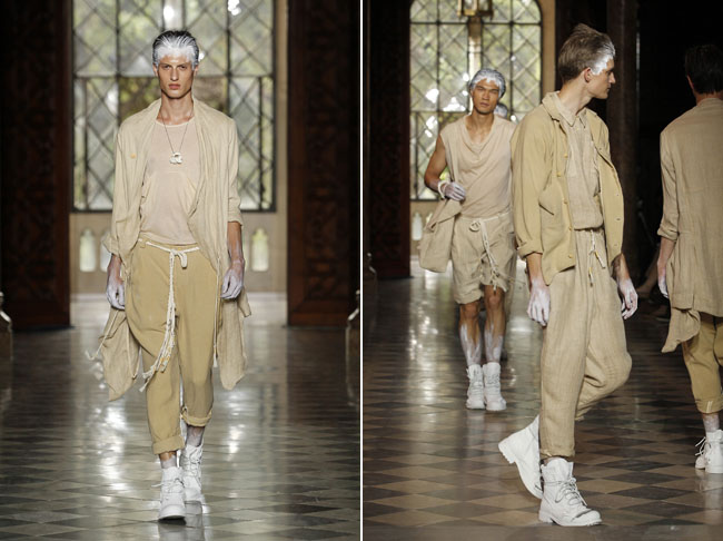 Brain & Beast: El nuevo Ángel Vilda parece mucho más relajado y disperso que aquel que conocimos en sus primeros años como diseñador. Su colección, unificada por unos turbantes propios de los hombres del desierto, abarca desde el dénim reconstruido al patchwork militar, pasando por camisetas con tipografías heavies, estampados cachemir, drapeados, torsiones, tules, rejillas… todas las tendencia en una sola colección.