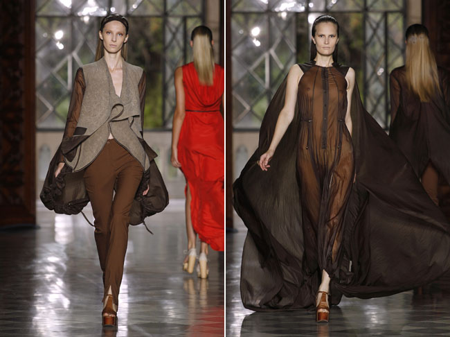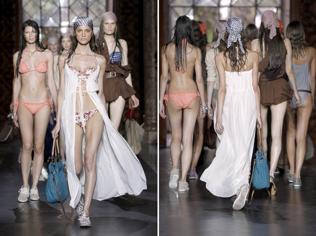 Mango: Una pasarela pública no funciona como el sistema de vivienda protección oficial, donde se exigen unos requisitos, mínimos y máximos, para acceder a un piso; ni tampoco como la Seguridad Social, donde todo el mundo puede beneficiarse de ella en igualdad de condiciones, aunque los que más ganan sean los que más aporten al sistema. Eso es lo bonito de la democracia, donde el voto de todos vale igual independientemente de sus ingresos (aunque, como ya dije, a más ingresos, mayor debe ser la contribución). Sin embargo, en las pasarelas públicas no existe ningún mecanismo que regule la participación de las marcas, salvo el criterio del que circunstancialmente las regula. Creo que quizás debería regularse de alguna forma por el beneficio de todos. Independientemente de todo este discurso democrático, Mango presentó una colección femenina y masculina (H.E. by Mango) que sin llegar a ser lo nunca visto, tampoco desentonó con las propuestas de diseñadores independientes. Es cierto que la propuesta de Mango es más generalista, orientada al gran público, menos radical, menos de autor, pero igual de válida y, al fin y al cabo, más real. Lo interesante sería saber qué ocurriría si la gran estructura de Mango estuviera puntualmente al servicio de pequeñas firmas minoritarias como experimento creativo social.