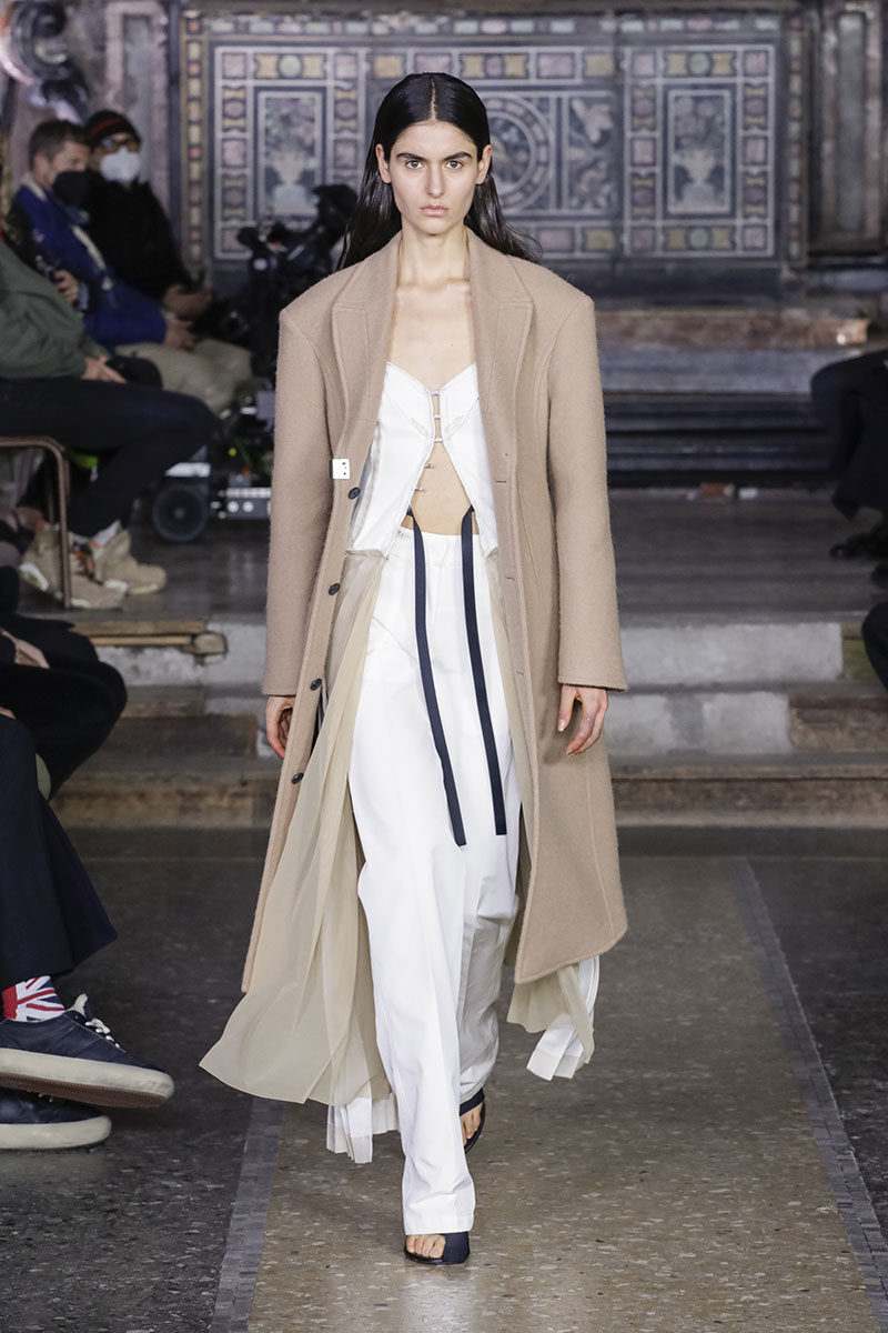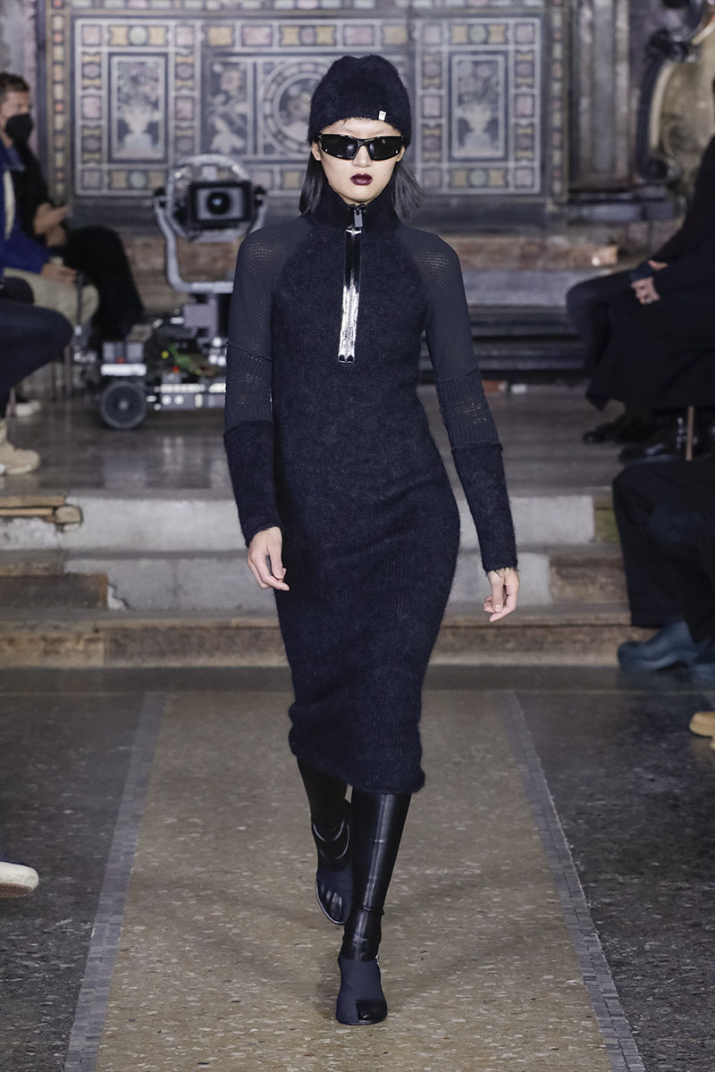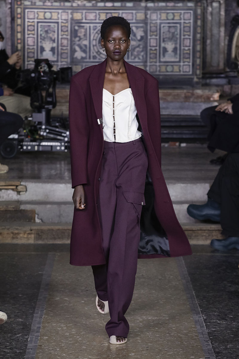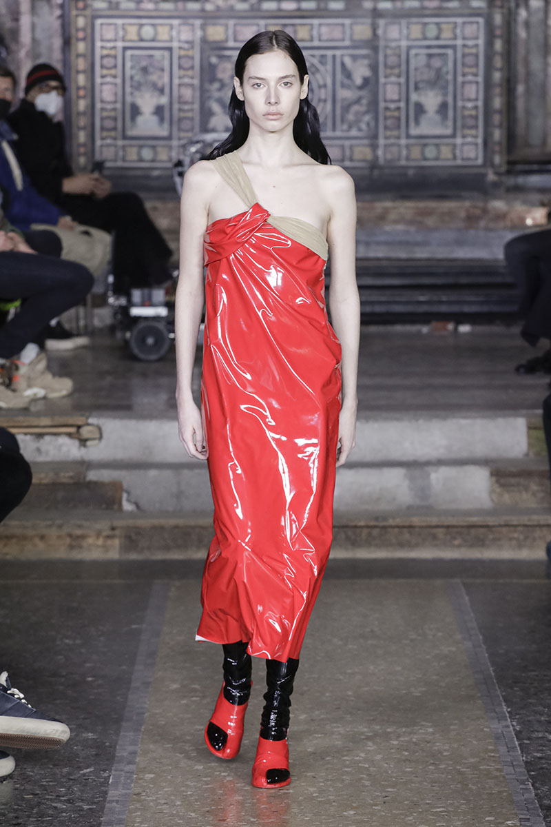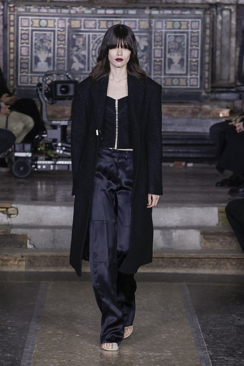 La marca también incluye elementos de sastrería a partir de lanas con mucha textura y densidad y materiales elásticos más modernos. Los vestidos de mujer se ciñen al cuerpo con estructuras sin rematar y cortes abiertos e invertidos que se complementan con correas en contraste con detalles metálicos.