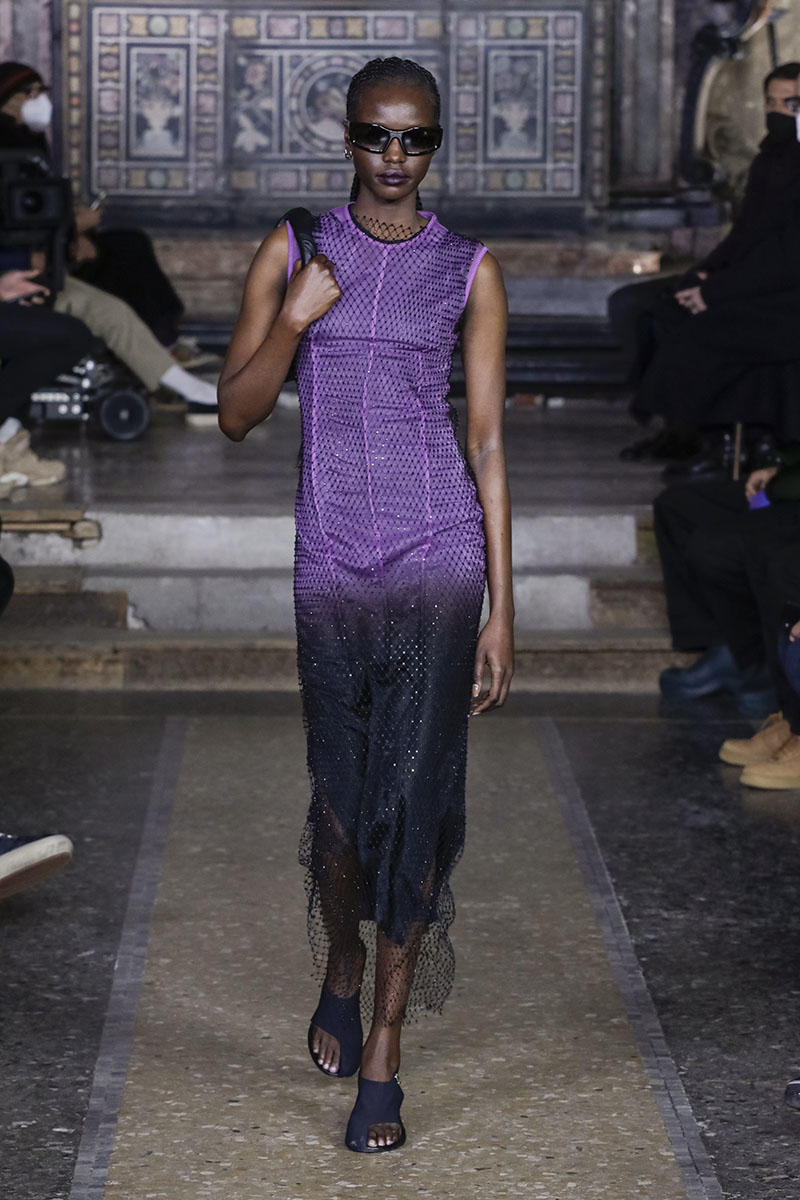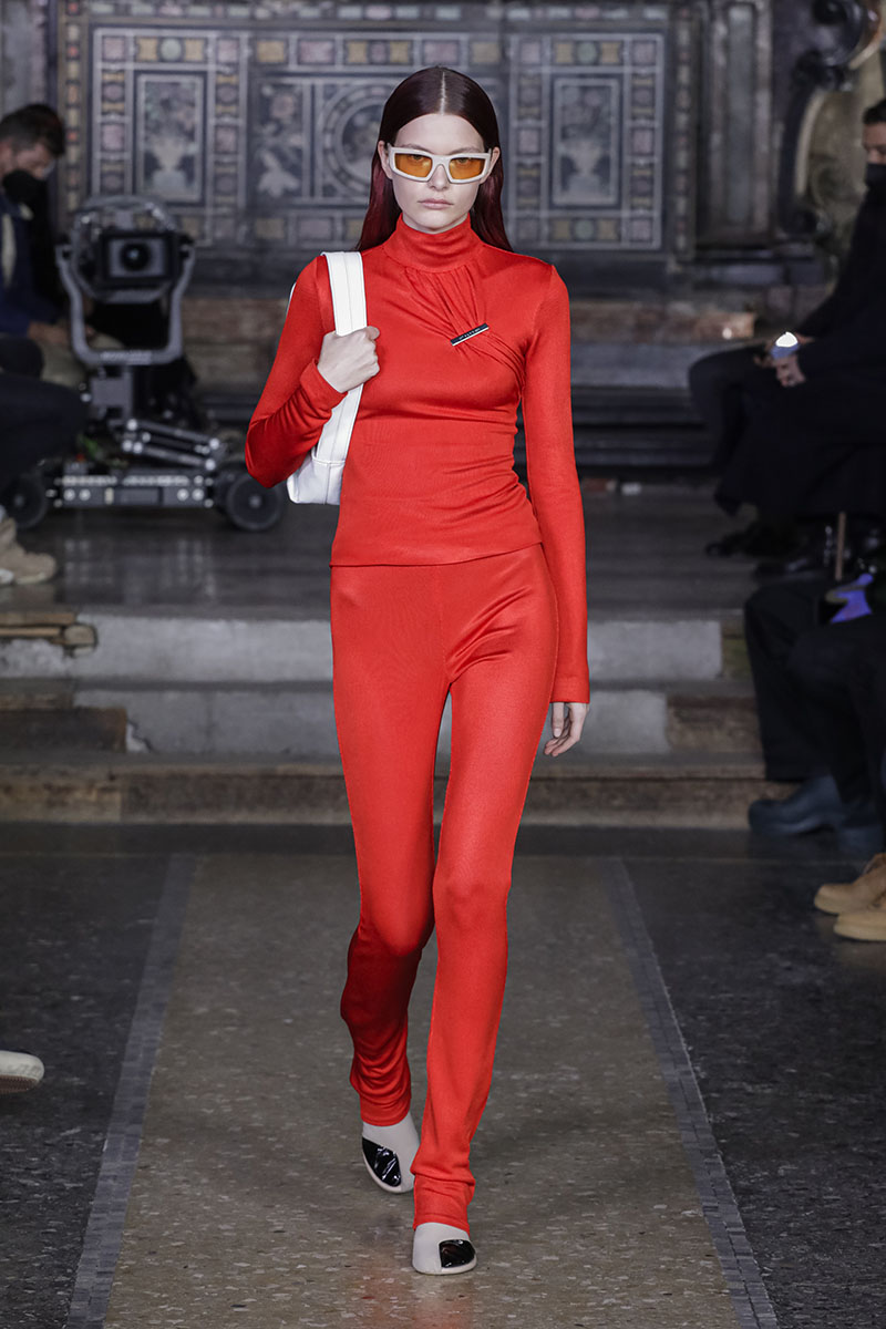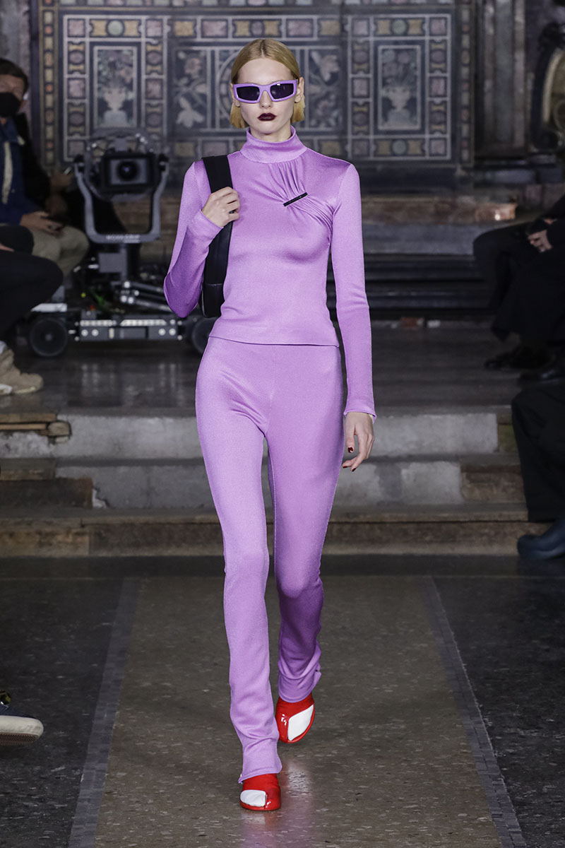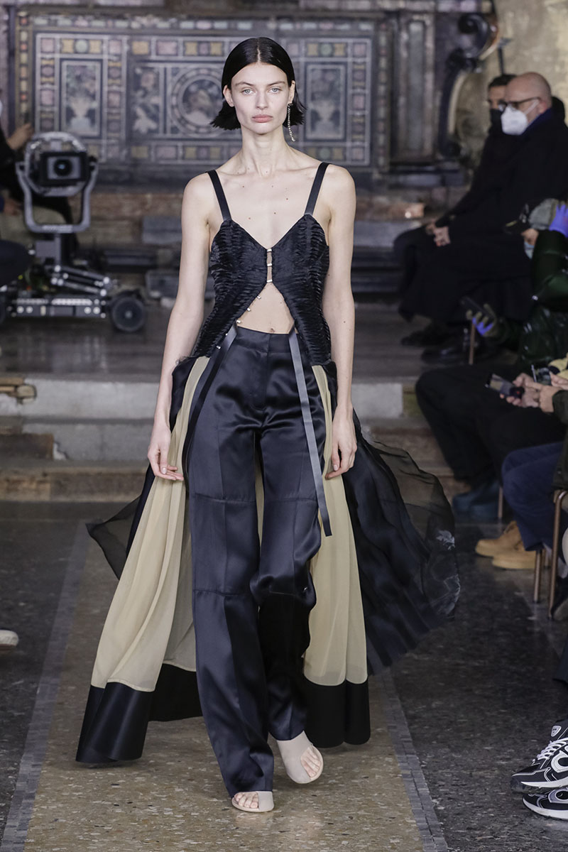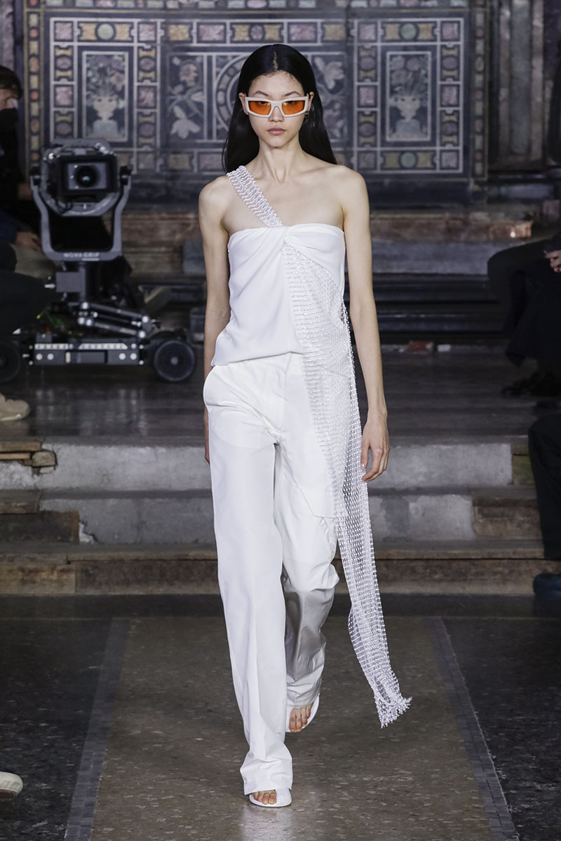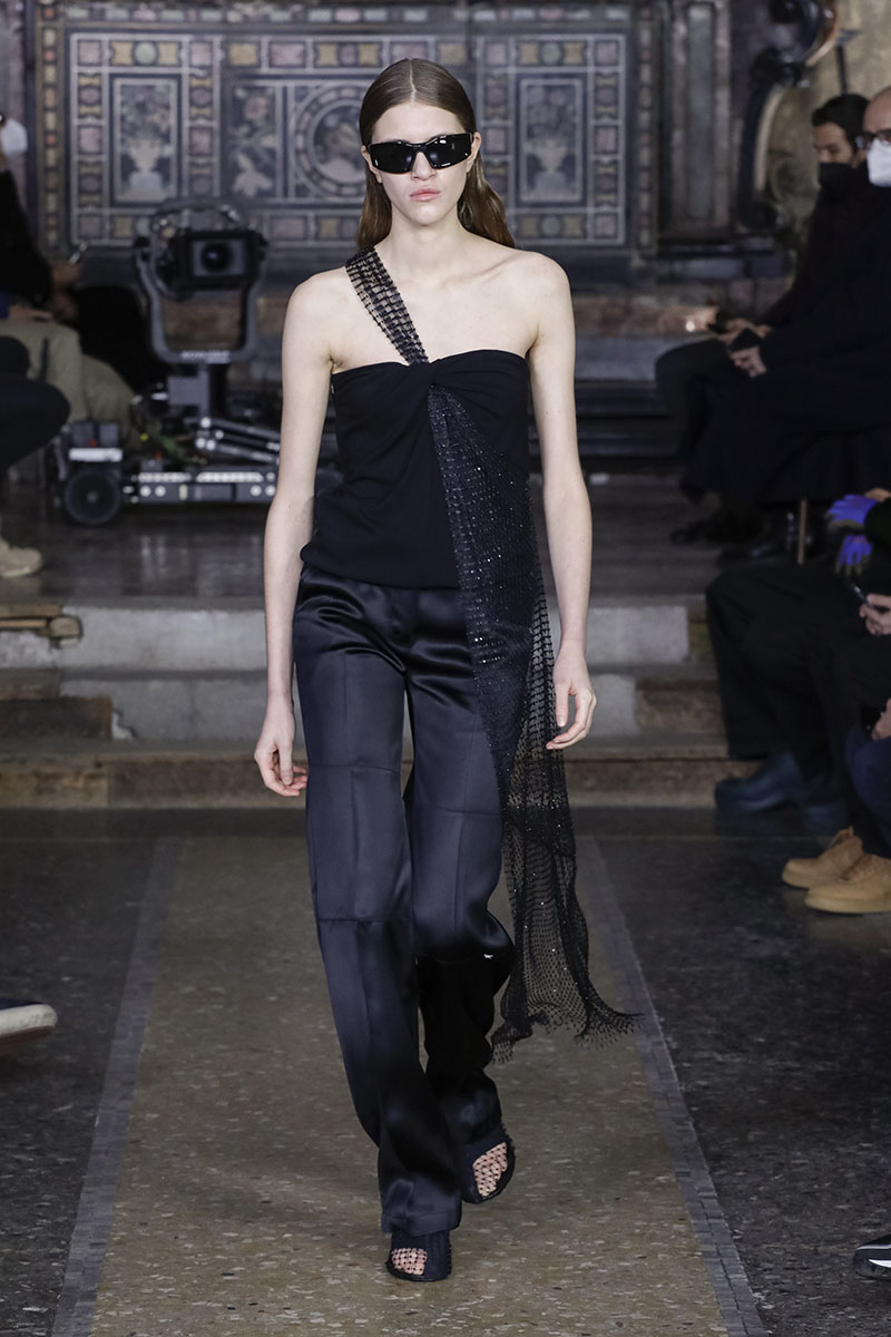 La marca también incluye elementos de sastrería a partir de lanas con mucha textura y densidad y materiales elásticos más modernos. Los vestidos de mujer se ciñen al cuerpo con estructuras sin rematar y cortes abiertos e invertidos que se complementan con correas en contraste con detalles metálicos.