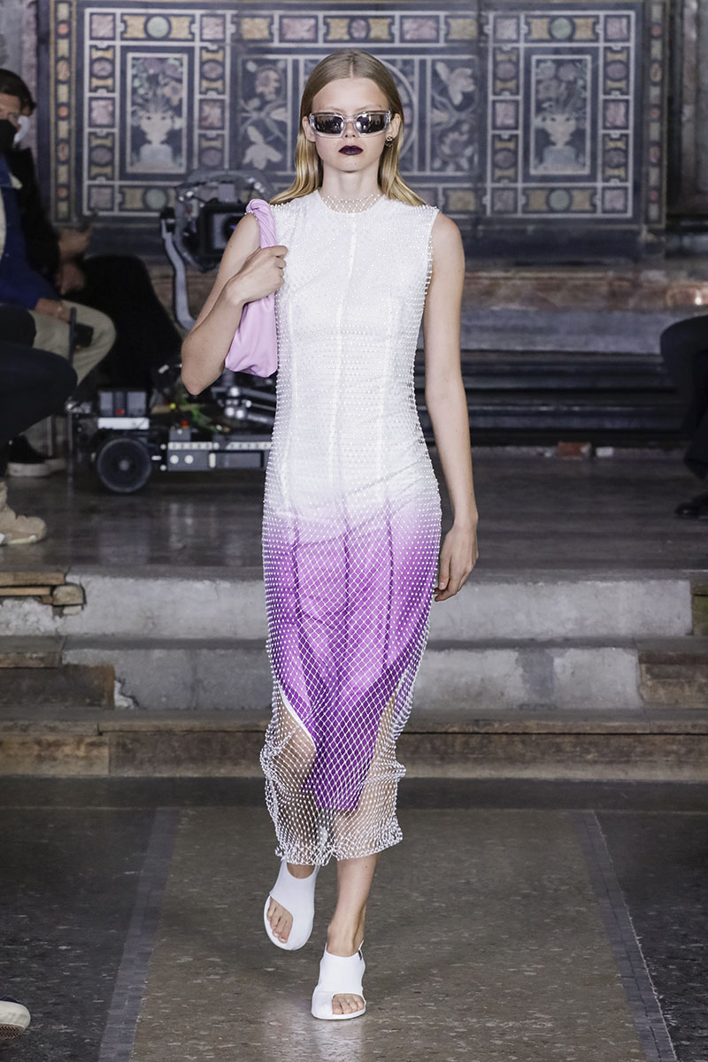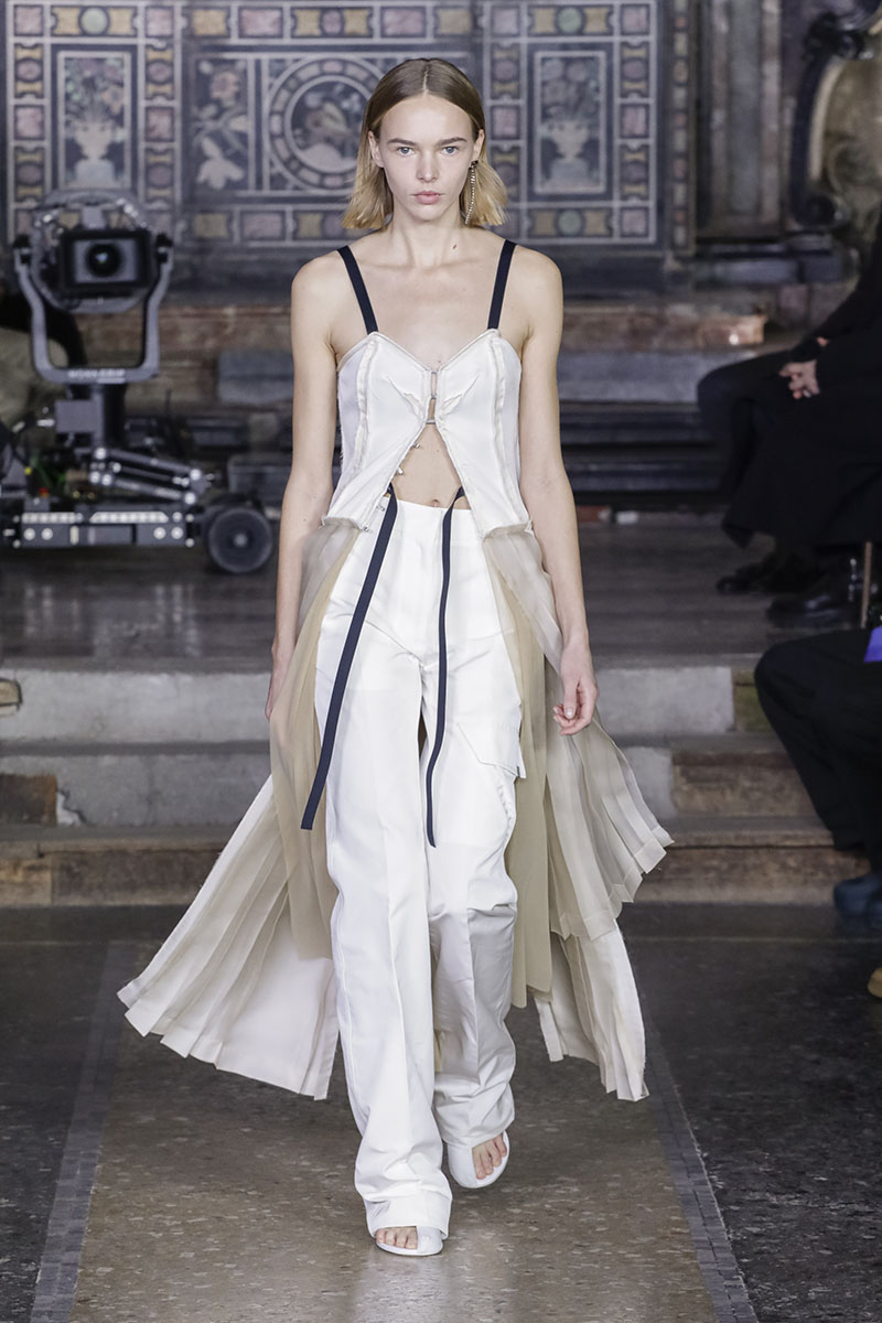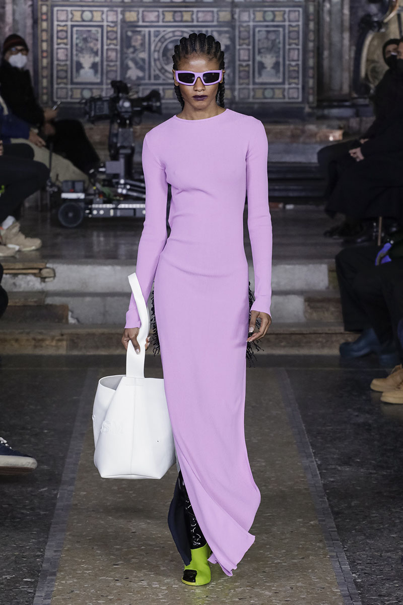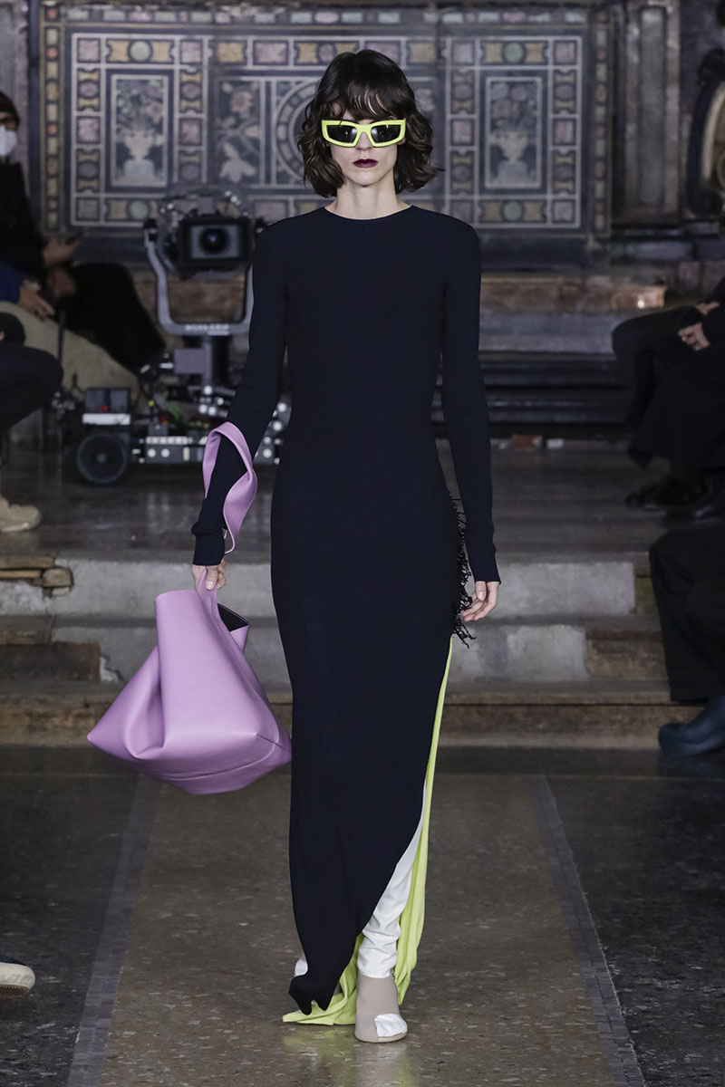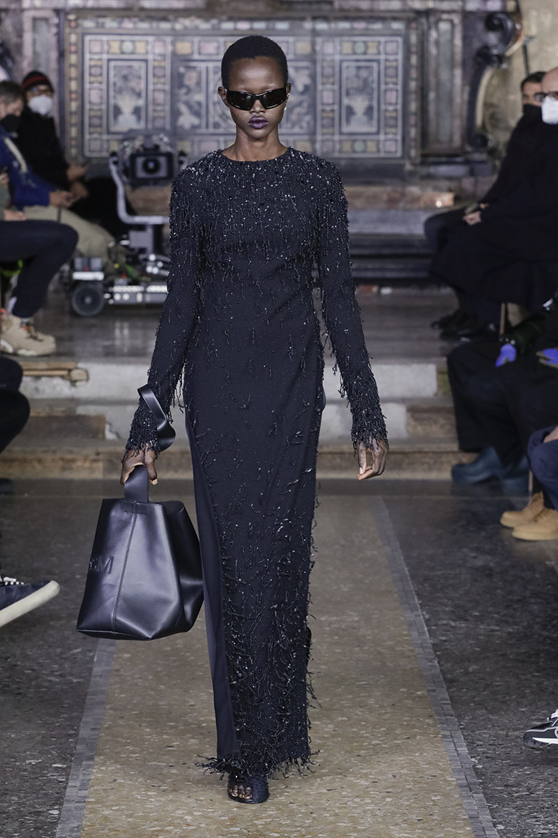La marca también incluye elementos de sastrería a partir de lanas con mucha textura y densidad y materiales elásticos más modernos. Los vestidos de mujer se ciñen al cuerpo con estructuras sin rematar y cortes abiertos e invertidos que se complementan con correas en contraste con detalles metálicos.