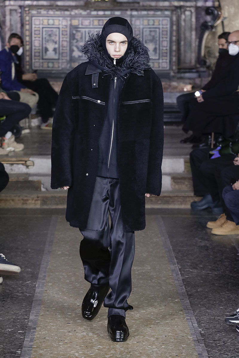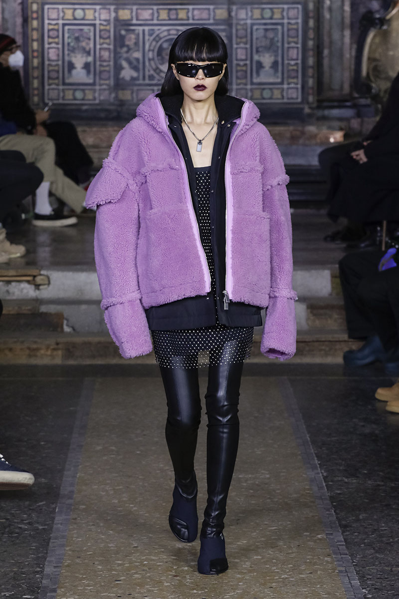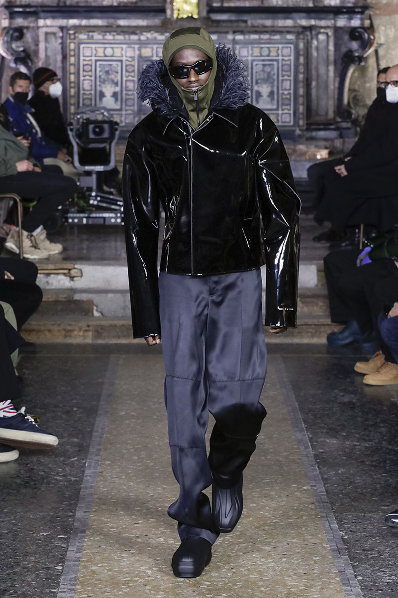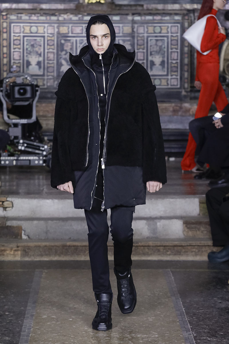 La colección cuenta con una selección de chaquetas y chalecos acolchados que se han construido en los tejidos más utilizados en la producción de pantalones de chándal y sudaderas. El contraste de tejidos en la colección es bastante fuerte en general, ya que se mezcla lo natural y lo técnico a través de combinaciones inesperadas de materiales naturales y sintéticos, como cuero, piel de oveja y nailon, boucle y PVC, lanas texturizadas.
