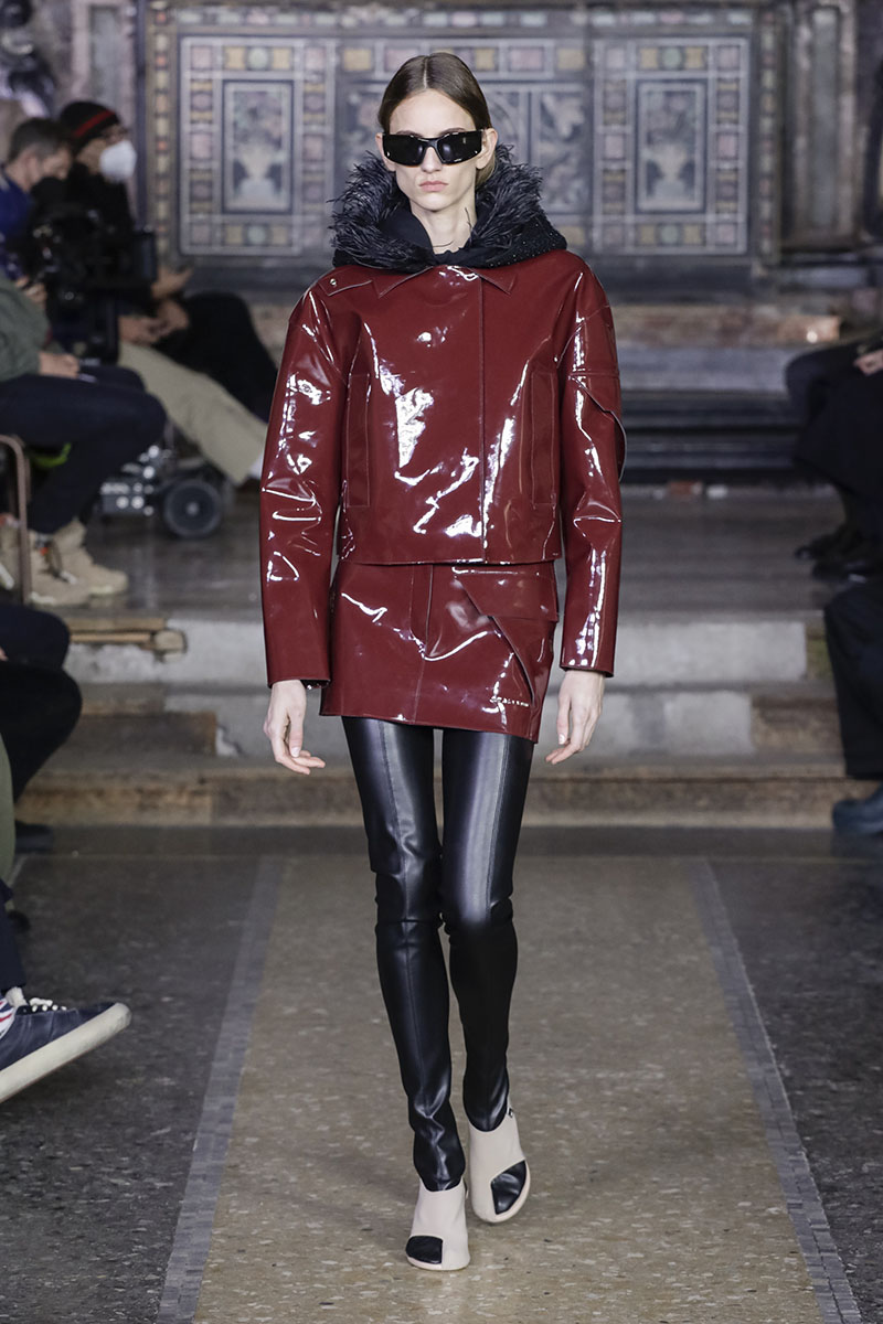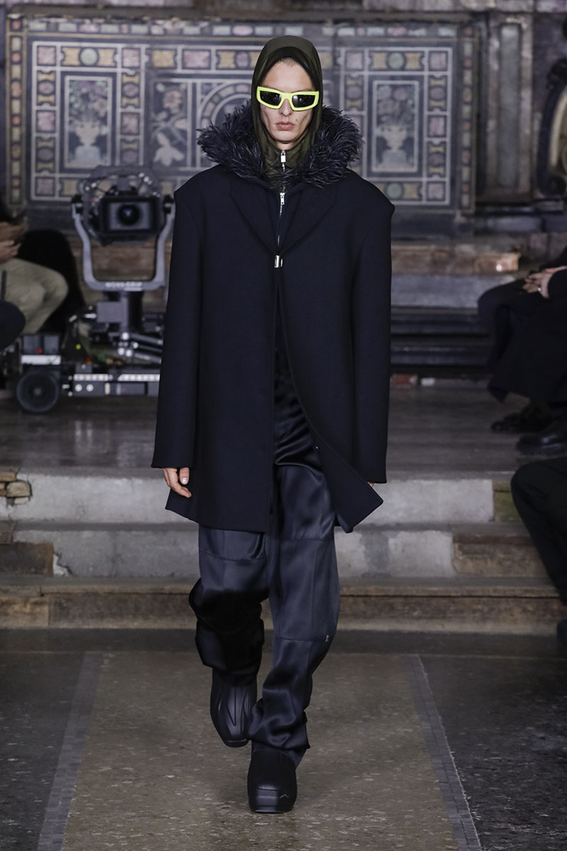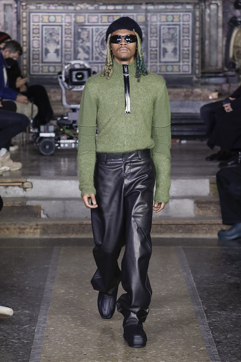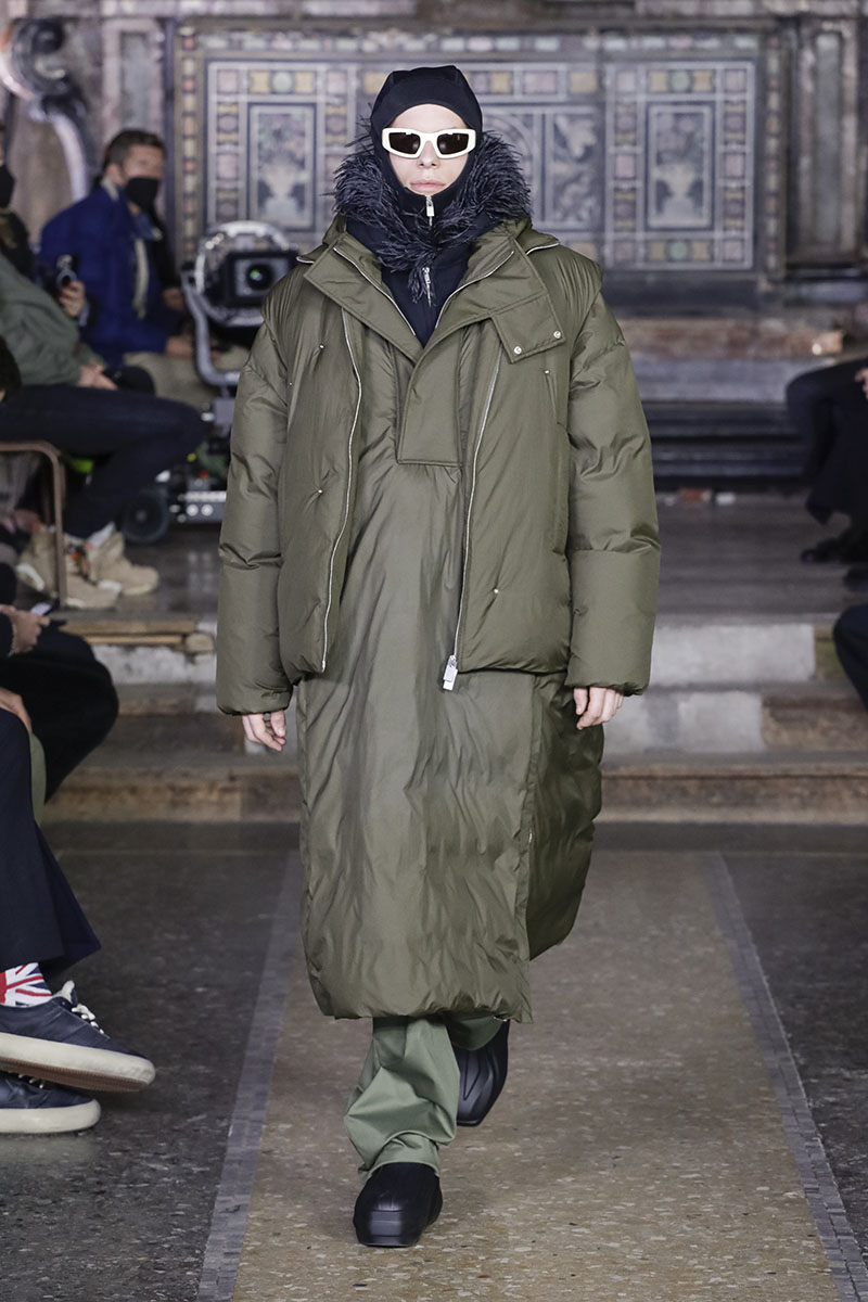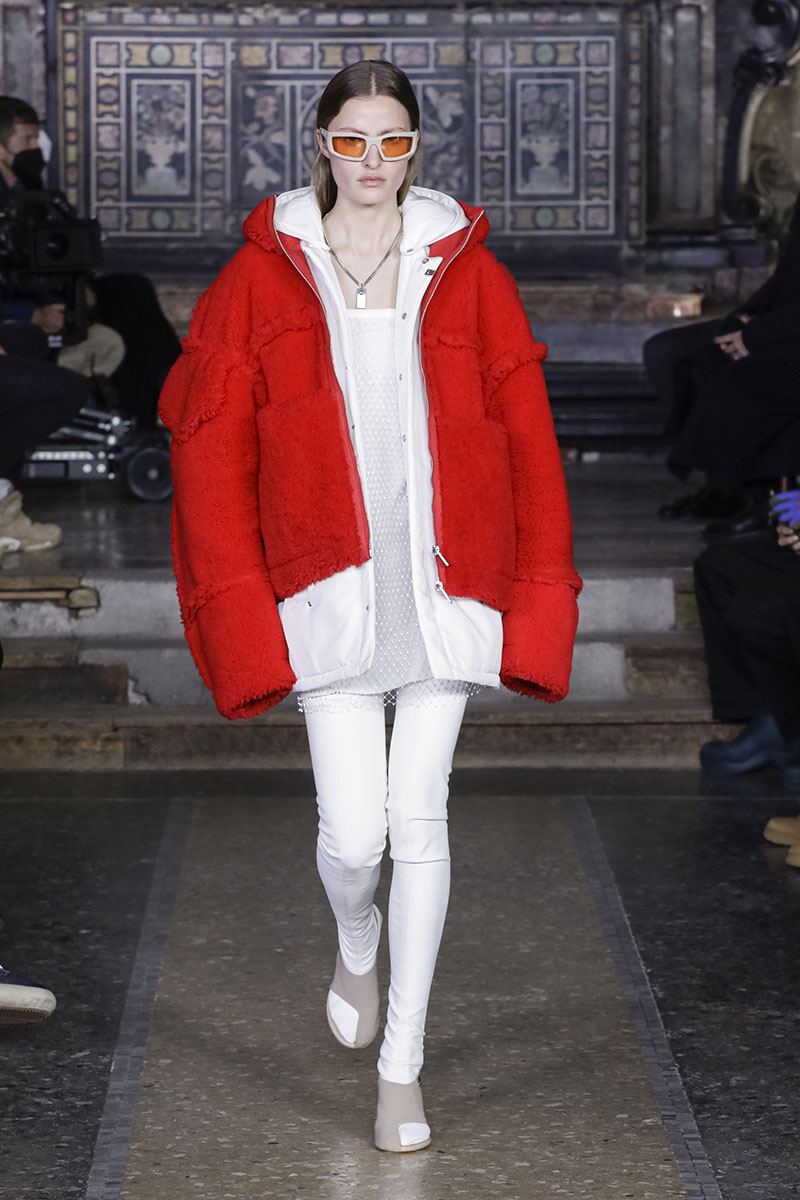 La colección cuenta con una selección de chaquetas y chalecos acolchados que se han construido en los tejidos más utilizados en la producción de pantalones de chándal y sudaderas. El contraste de tejidos en la colección es bastante fuerte en general, ya que se mezcla lo natural y lo técnico a través de combinaciones inesperadas de materiales naturales y sintéticos, como cuero, piel de oveja y nailon, boucle y PVC, lanas texturizadas.