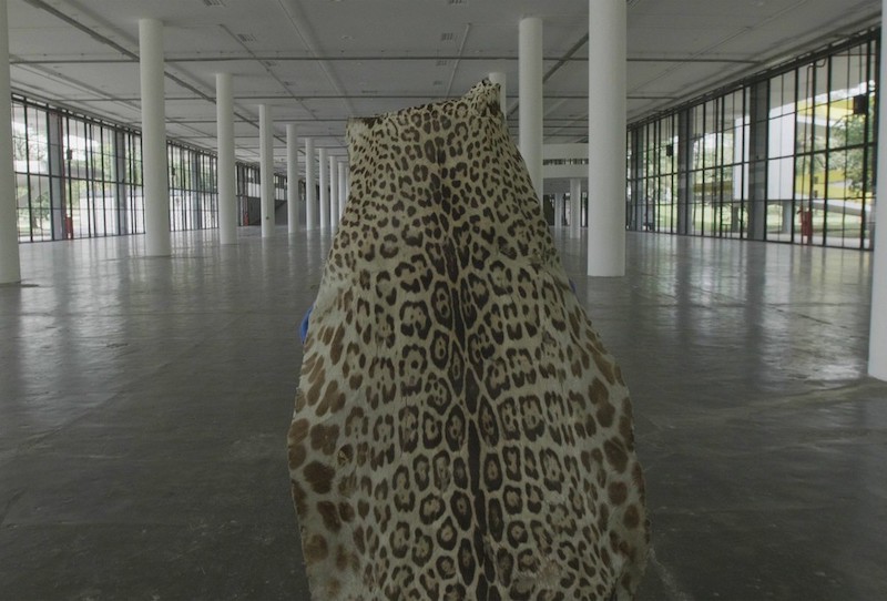 Camino del gran atrio de KW, las cosmovisiones de la comunidad maya Kaqchikel rodean nuestro acceso hacia el espacio central del edificio. En el video Sueño de obsidiana (2020), del artista guatemalteco Edgar Calel viste una piel de jaguar, animal espiritual en la cosmología maya y realiza un ritual para el reconocimiento de la tierra indígena dentro de uno de los iconos de la arquitectura modernista brasileña: el Pabellón de la Bienal de São Paulo de 1954 en el Parque de Ibirapuera. Bajo la piel, el artista lleva puesto un jersey –también en exhibición en la galería daad– bordado con el nombre de las 23 lenguas indígenas que se hablan en el territorio guatemalteco, un saber ancestral que ha ayudado al artista y su pueblo a resistir el embate colonial.