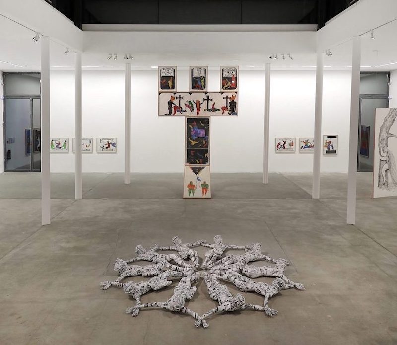 Y ya por fin en el atrio, el gran espacio abierto y central de KW se ha convertido en una suerte de santuario queer, en cuyo centro reposan diez estatuas de Jesús de tamaño natural del artista coreano Young-jun Tak. Formando un círculo en el suelo, sus cuerpos están cubiertos de panfletos homofóbicos que los fanáticos cristianos sudcoreanos reparten habitualmente.