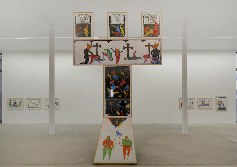 Esa intolerancia también se expresa en la serie de pinturas del artista brasileño Pedro Moraleida Bernardes —muerto por suicidio a los 22 años— situadas justo detrás de esta pieza y dispuestas en forma de políptico suspendido a modo un retablo. Los seis paneles representan, de manera bruta y neoexpresionista de lo sagrado y lo degradado, escenas de lujuria, violencia, mortificación y humillación.