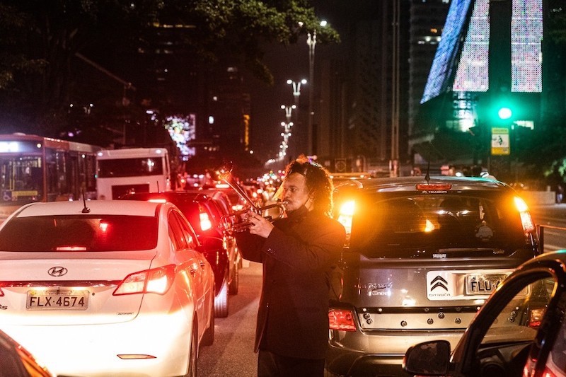 Al igual que Movilización, la pieza del colectivo brasileño Teatro da Vertigem documenta también una acción muy contemporánea, llevada a cabo por el grupo apenas hace un mes, el 4 agosto de 2020. En Marcha à ré (Marcha atrás), una procesión funeraria de alrededor de 120 coches intenta abrirse paso circulando marcha atrás por la Avenida Paulista, centro financiero de São Paulo. La pieza aborda la necropolítica del régimen populista de extrema derecha en Brasil, actualmente involucrado en un genocidio de su propia población.