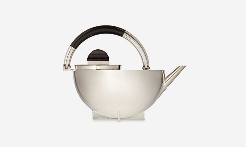 Imágenes superiores: 1/ Retrato de Greta Grossman y su Gräshoppa Floor Lamp (1947) Foto: Gubi 2/ Kettle (1925–26) de Marianne Brandt. Foto: ©Tecnolumen