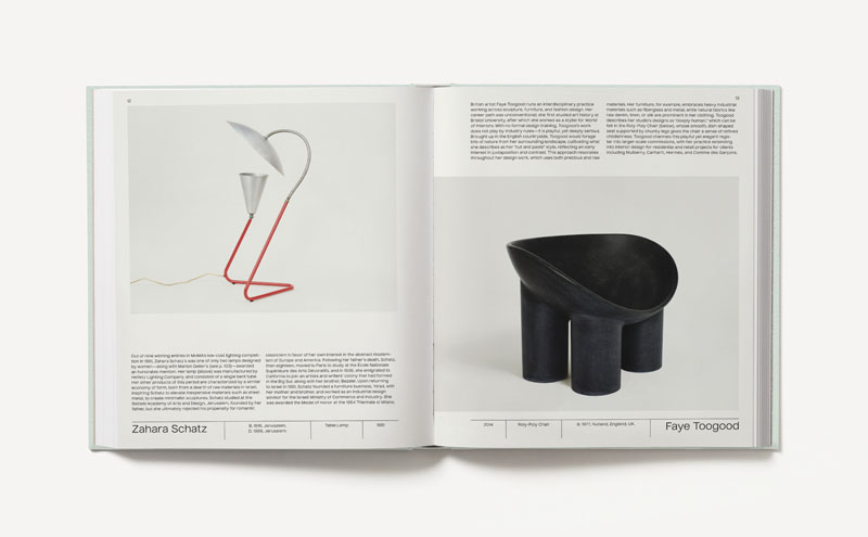 Imagen superior: Doble página del libro Woman Made, a la izquierda Table Lamp (1951) de la diseñadora Zahara Schatz, a la derecha Poly-Poly Chair (2014) de Faye Toogood