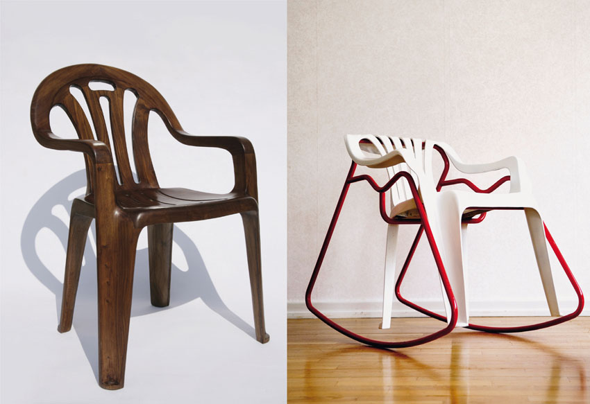 A la izquierda, Plastic chair in wood de Maarten Baas. A la derecha, Rocking chair de Rebecca Ahlstedt.