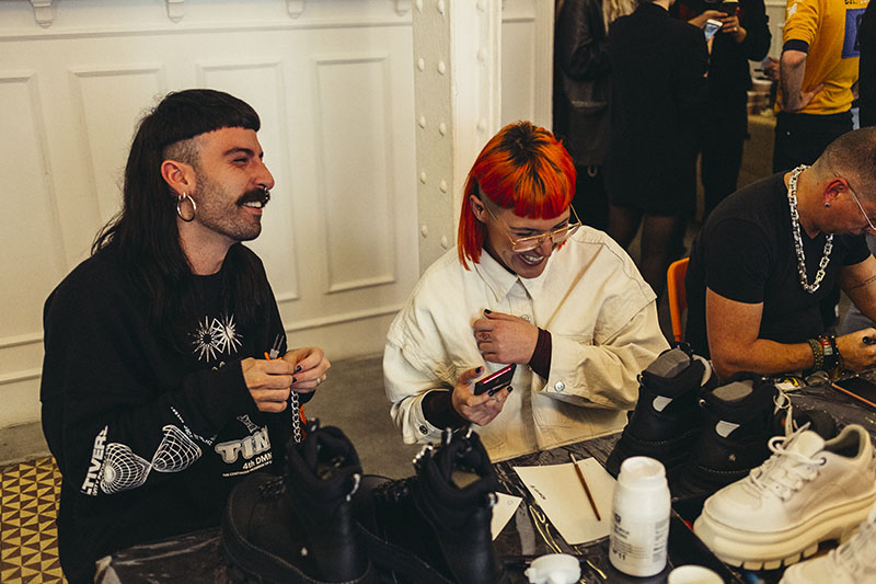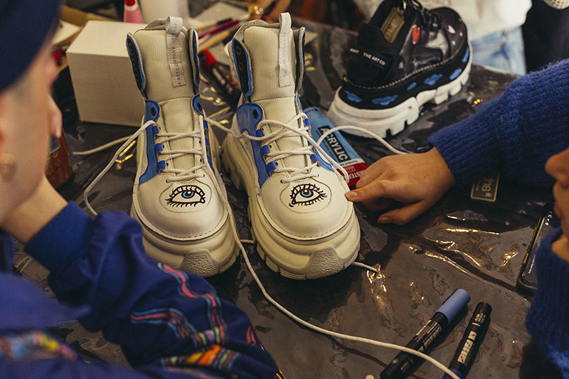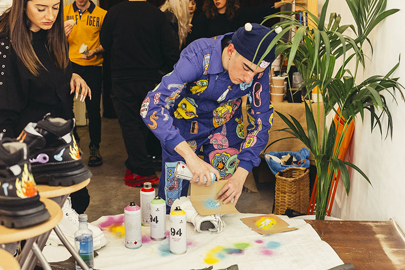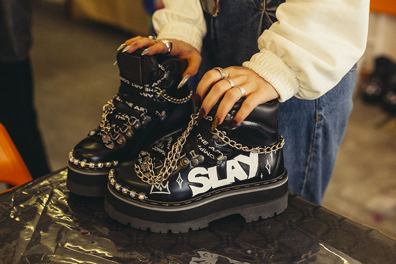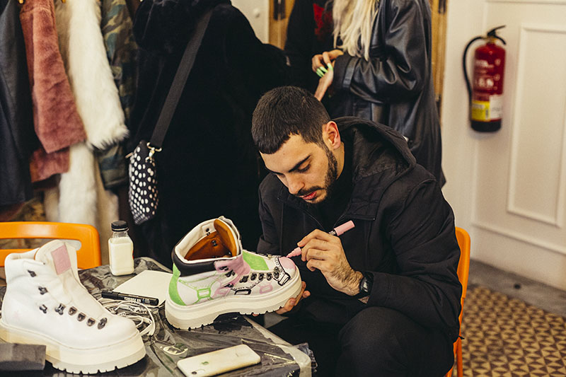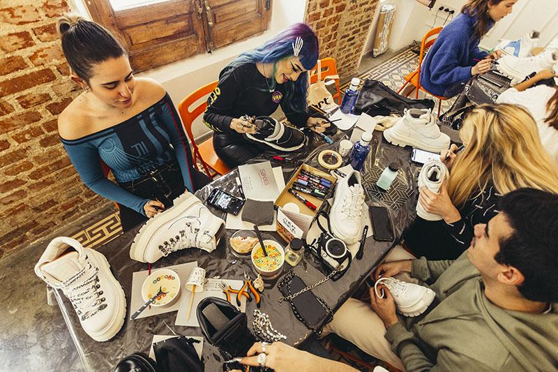 Después del debate, el eventazo seguía. La mesas se llenaron de botas y zapatos XXL para ponernos manos a la obra. Purpurina, cadenas, remaches, pintura acrilica… un universo infinito de posibilidades se interponía entre los participantes y un modelo de ART al que no nos hacía demasiada gracia “destrozar”. Por suerte ahí estaba Charlie Smits para ayudarnos, ilustrador mallorquín que con tan solo 19 años ha conseguido hacerse un hueco en la escena artística nacional más underground y alternativa.