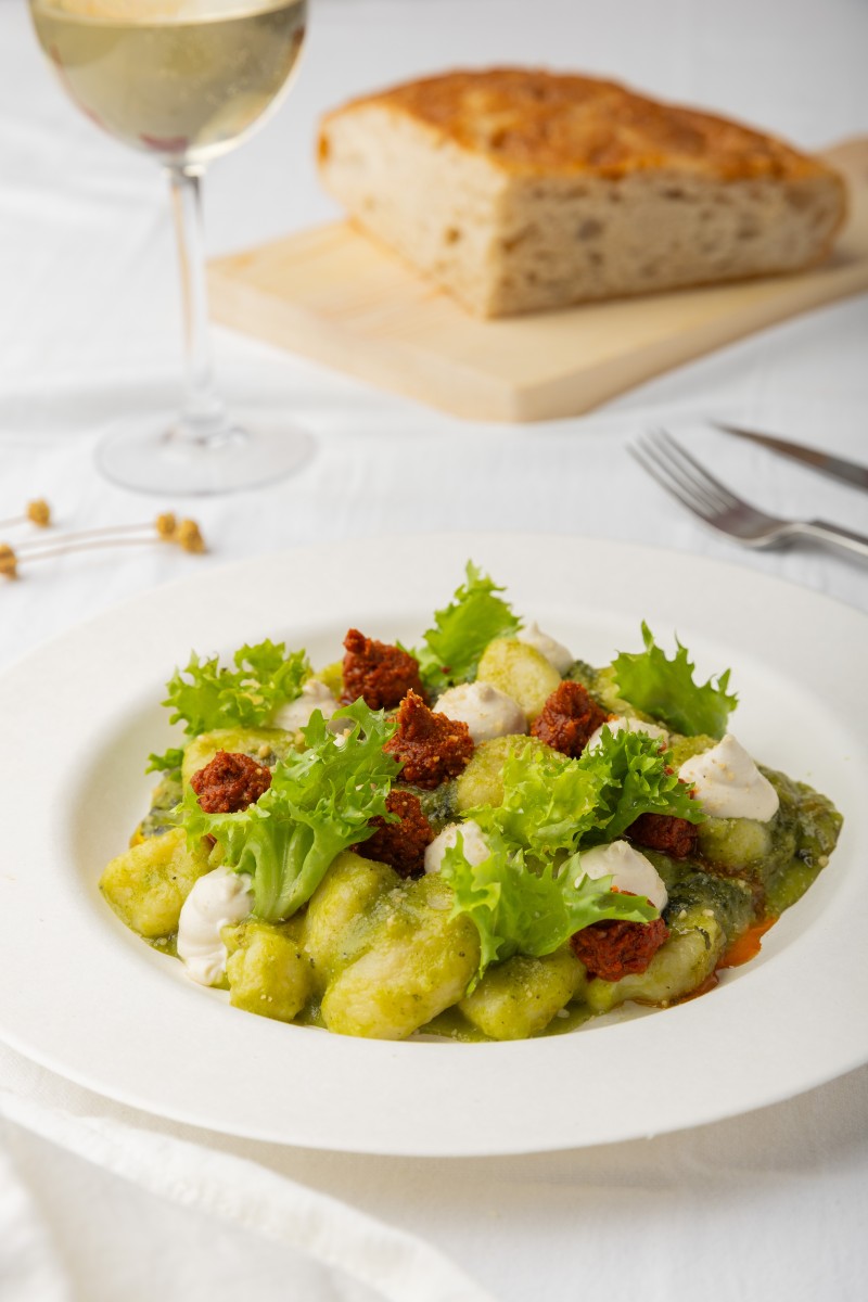 Entre las opciones destacan los trofie al pesto (10 €), el pacchero alla Norma con ricotta de almendras (10,50 €) y los gnocchi con crema di zucca e noci (14,90 €) elaborada con una crema de nueces, tomillo y calabaza, consiguiendo una textura y un sabor sorprendentemente similares a la receta original.