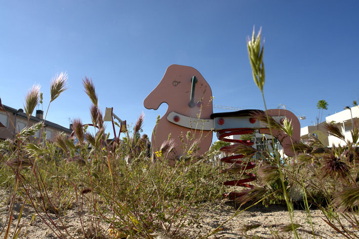 “Al venirse abajo las expectativas de negocio por la coyuntura económica, esta estructura se desmorona en poco tiempo; las zonas infantiles se llenan de maleza, las moquetas de césped se llenan de arena, defecaciones animales y basura y los árboles se secan, algunos sin haber salido de la bolsa de trasplante”, explica Olmo, quien encuentra “un arboricicio” en el barrio “como testigo de la falta de interés real de los empresarios por construir un espacio habitable”.