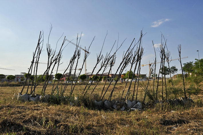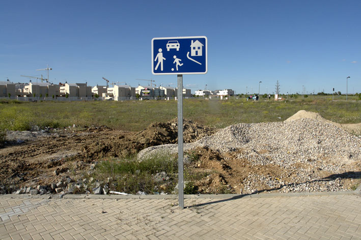 Solares vacíos. Grúas. Árboles secos. Baldosas rotas. Es Soto del Henares, el barrio más nuevo de Torrejón de Ardoz, donde se levantarán 7.000 viviendas. En medio de ese caos, restos de intentos por crear una apariencia agradable a los posibles compradores. Se trata, para el fotógrafo Olmo González, de “un falso estado de habitabilidad sostenido a base de zonas infantiles de recreo, árboles trasplantados y metros y metros cuadrados de césped artificial”. Una situación que relata en 33 imágenes y un objeto (un árbol seco de dos metros) que forman parte de la exposición colectiva ‘Inútil’.
