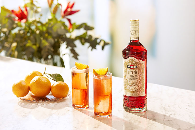 Llenar un vaso alto con hielo, verter Martini Rosso y Martini Riserva Speciale Bitter, cubrir con agua con gas y remover suavemente. Decorar con un gajo de naranja.