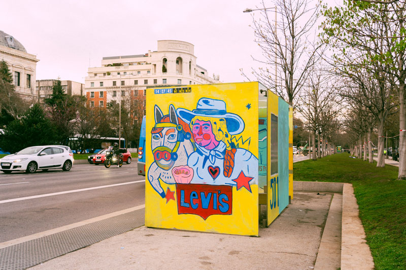 Bueno, en realidad el jean 501 de Levi’s ahora mismo protagoniza dos exposiciones urbanas en Madrid. Una de ellas es una expo callejera que va desde el Paseo del Prado hasta Recoletos. Un recorrido en el que verás a las marquesinas de autobús intervenidas por diferentes creadores de la escena creativa española. La inspiración para todos ha sido la misma: el icónico 501 jean de Levi’s. Y la segunda exposición callejera se realiza en la calle Serrano de Madrid. Allí, los mismos artistas que han intervenido las marquesinas, con consentimiento de la EMT, presentan una pieza customizada por ellos mismos. Un homenaje a la prenda más mítica de la moda realizada justo en la Semana de la Moda de Madrid.