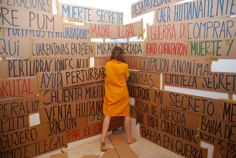 A escala humana La Ribot es una exposición sobre el rol del cuerpo su la producción artística. Un proyecto sobre la noción del cuerpo y su presencia-ausencia. Tanto como vehículo de lenguaje como la relación que establece con el edificio (el espacio) y los objetos expuestos. Paredes y sillas escritas, cuadernos, polaroids, cartones, sonido, videos filmados cámara en mano junto con performances en vivo, forman parte de la muestra.