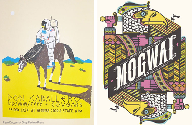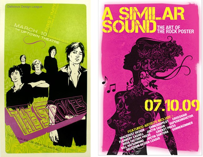 Un binomio perfecto que la Galería Fill in the blank ,de Chicago, ha sabido mostrar de la mejor manera posible: con carteles homenaje a bandas de rock. Los artistas Cricket Press, Crosshair, Delicious Design League, Drug Factory Press, Flannery Cashill, Jetsah, Just!n Eagan, Justin Santora, Kill Hatsumomo, Someoddpilot, Sonnenzimmer, Spacedust Design, and SuperKonductor han elaborado nada más y nada menos que 74 carteles de grupos de rock como The Strokes, Ashley Miller, Mogwai, This is My Condition, Crystal Antlers o Bonnie Prince Billy, entre otros. Muchos de ellos son auténticas joyas gráficas así que a disfrutarlas. La exposición A similar sound se inaugura hoy mismo y estará abierta hasta el 8 de Agosto así que estáis a tiempo.
