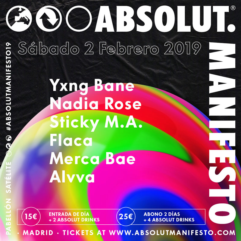 La música urbana será el común denominador de la noche del sábado 2 de febrero en Absolut Manifesto. En los escenarios veremos a: Yxng Bane, jovencísimo rapero inglés que los está petando desde hace 2 años… Sticky M.A. miembro importante de Agorazein, ahora en solitario… Nadia Rose, la famosa rapera británica, un hype cada vez que se mueve… la dj Flaca… el productor Merca Bae y la dj Alvva.