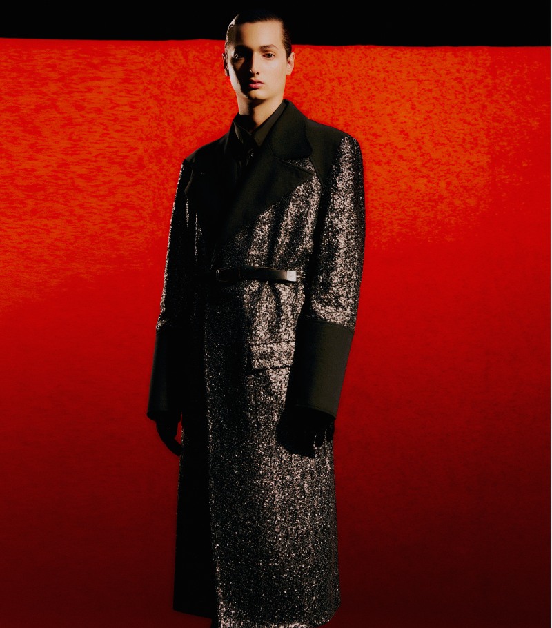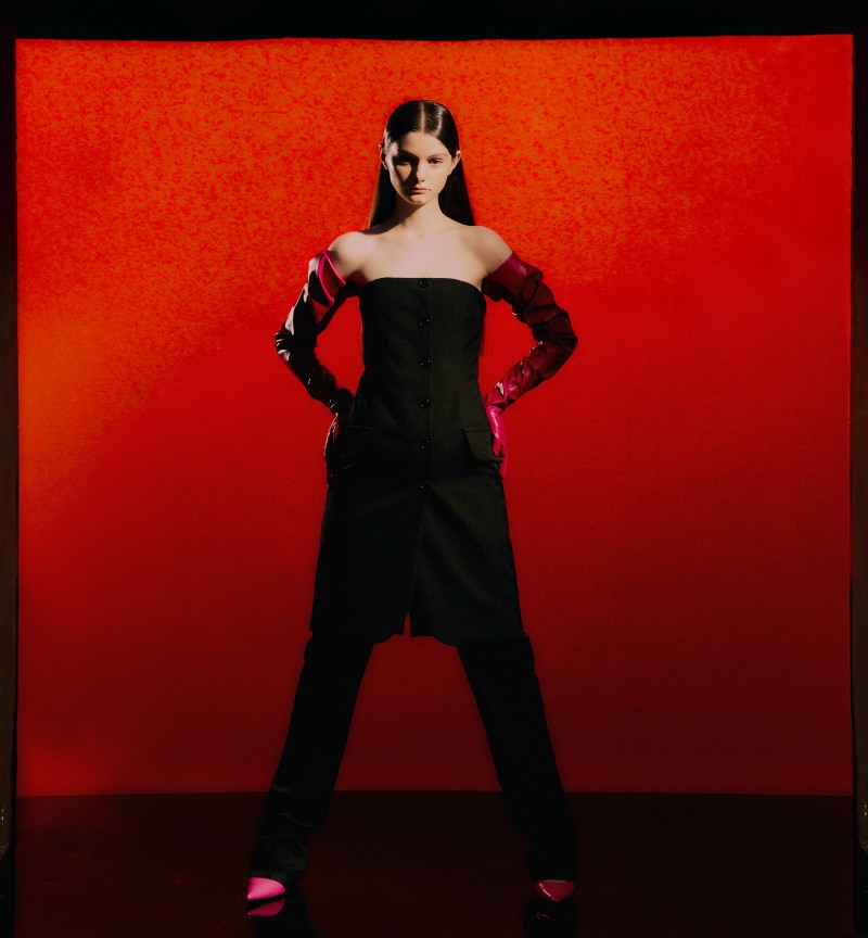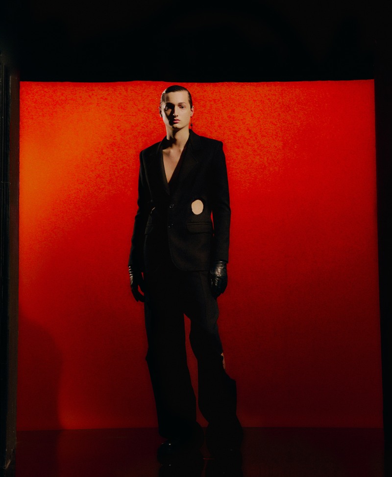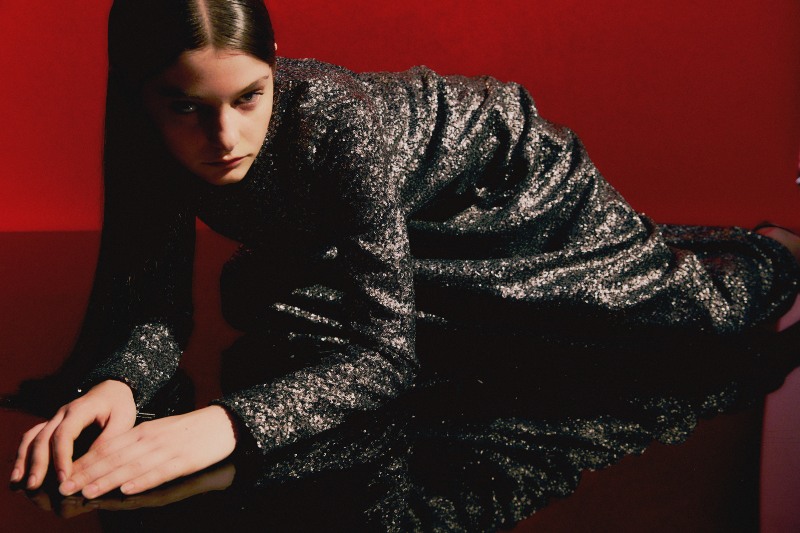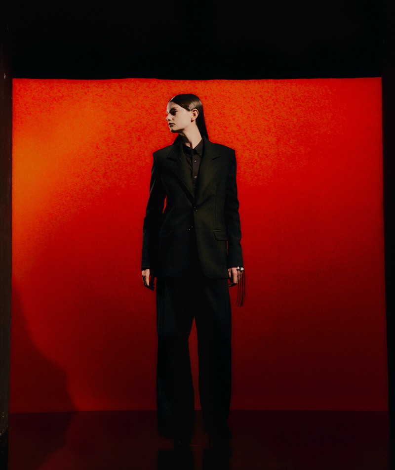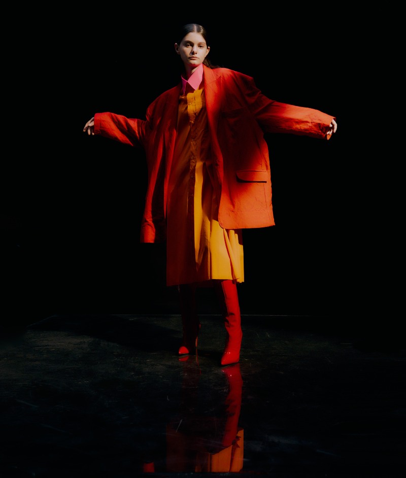 En esta colección, hemos utilizamos tejidos naturales como el algodón, la seda y la lana fría con materiales técnicos y lentejuelas. La base del color es el negro que le aporta fuerza y rigidez, que conviven con el rojo, naranja y fucsia, uno de los colores que nos transmite más oscuridad.
