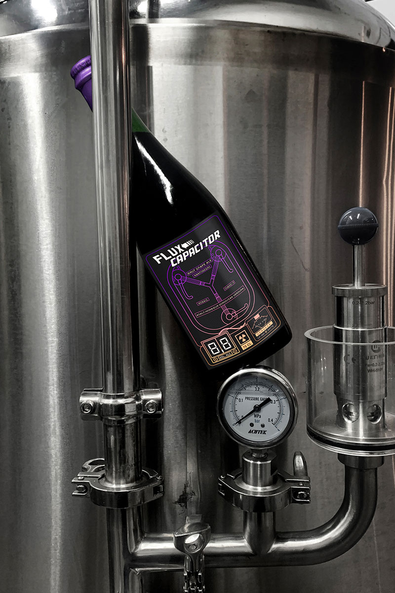 Esta edición limitada de 435 litros se presenta en botella de cava de 75cl. con una etiqueta, como siempre, exclusiva y muy especial. El artista Edu Martínez de Monsieur Gordo rinde homenaje al Doctor Emmet Brown de “Regreso al futuro” y a su gran obra maestra: el condesador de fluzo. El concepto sirve para materializar la metáfora del viaje interdimensional que rompe las fronteras convencionales entre vino y cerveza.