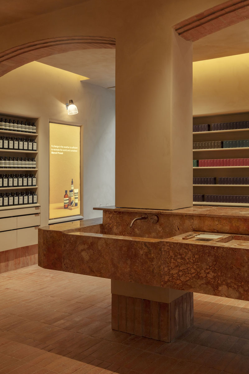 “Un sistema incorporado en la ventana frontal difunde los aromas de Aesop hacia la calle, despertando el sentido olfativo de los transeúntes. Los probadores de productos en el pórtico sirven como prólogo del interior de tonos cálidos, donde los arcos suaves y los azulejos decorativos evocan el legado morisco de Madrid y la arquitectura neomudéjar. Un agradable lavabo de travertino español rojo abraza dos columnas centrales y se convierte en el punto focal de todas las interacciones.” Nos comentan los autores del proyecto.