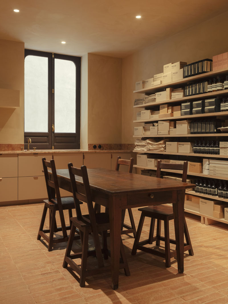 En su exterior han conservado la fachada neoclásica del edificio de 1923. El resultado es un espacio funcional y con carácter que aporta a la cadena Aesop otro punto de vista arquitectónico a su excelente catálogo de experiencias espaciales.