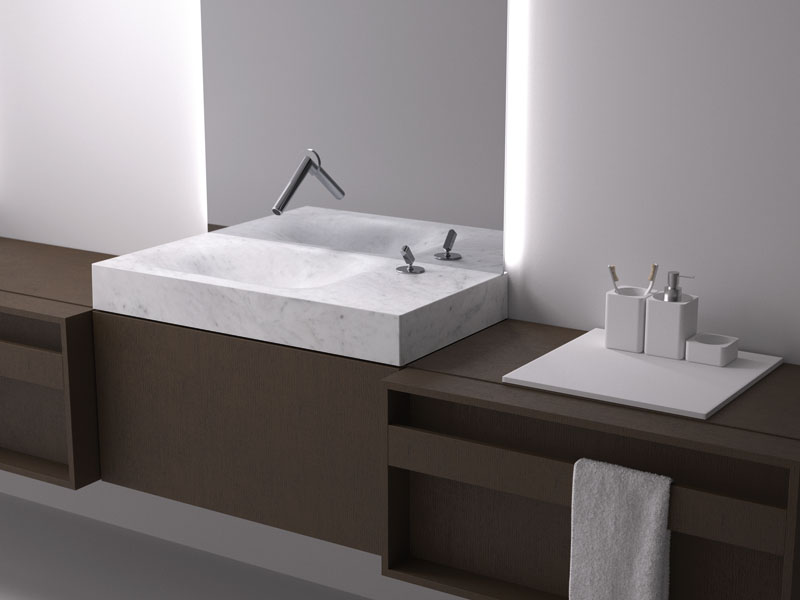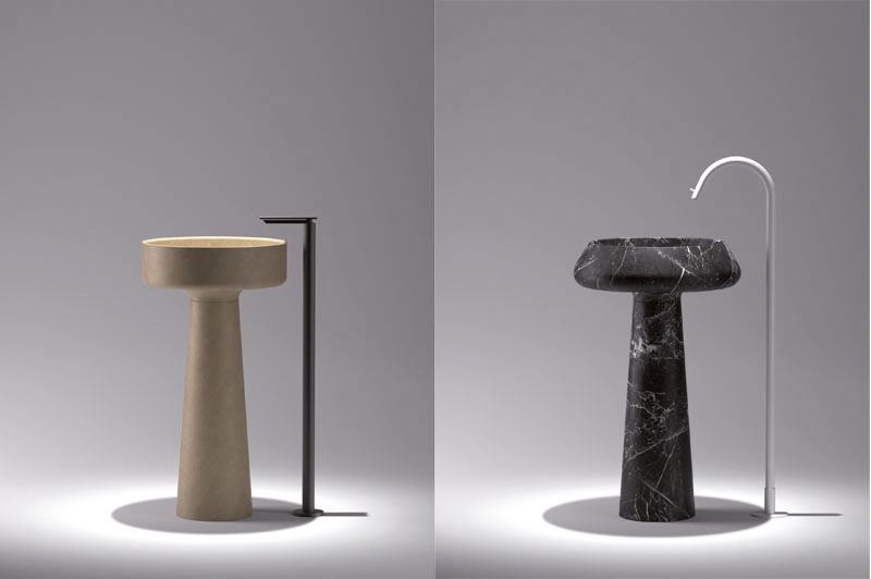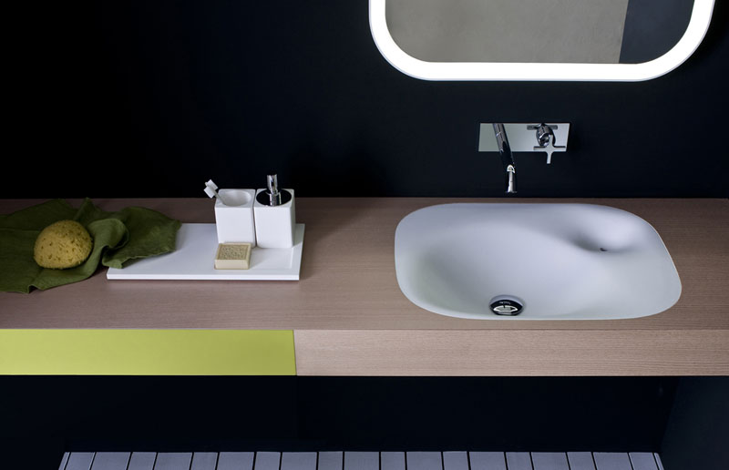 Arriba: Bjhon, un lavabo diseñado por Angelo Mangiarotti basado en un diseño propio de 1970. Igual que en el mundo de las cocinas la idea de isla ha tendido mucho éxito. En los cuartos de baño támbién se puede aplicar este concepto. Una fuente en mitad del toilette. Muy potente visualmente. Realizado en Cristalplant en blanco o con dibujo de mármol. Perfecto para proyectos contract o para proyectos residenciales con muchos metros cuadrados para utiliar