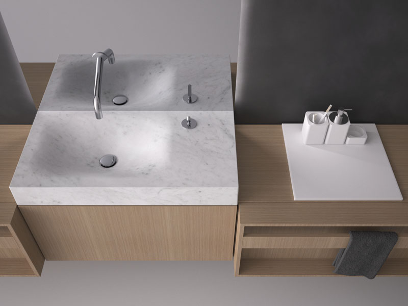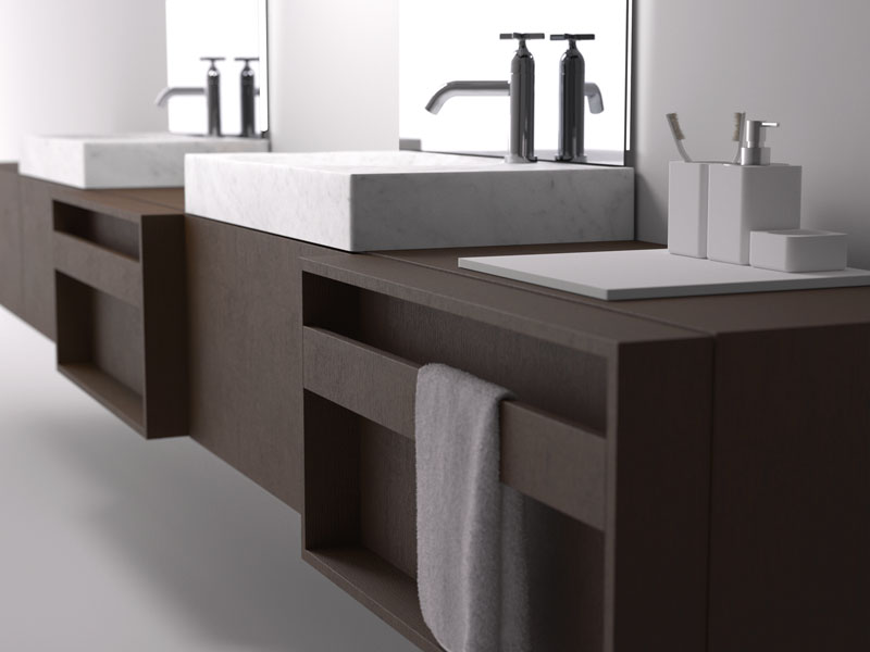 Arriba: Encimera FlatXL junto al mueble Plus con el toallero 815. Este útlimo un diseño del madrileño Javier López. Interesante toallero que sirve a la vez de tirador de la cajonera.