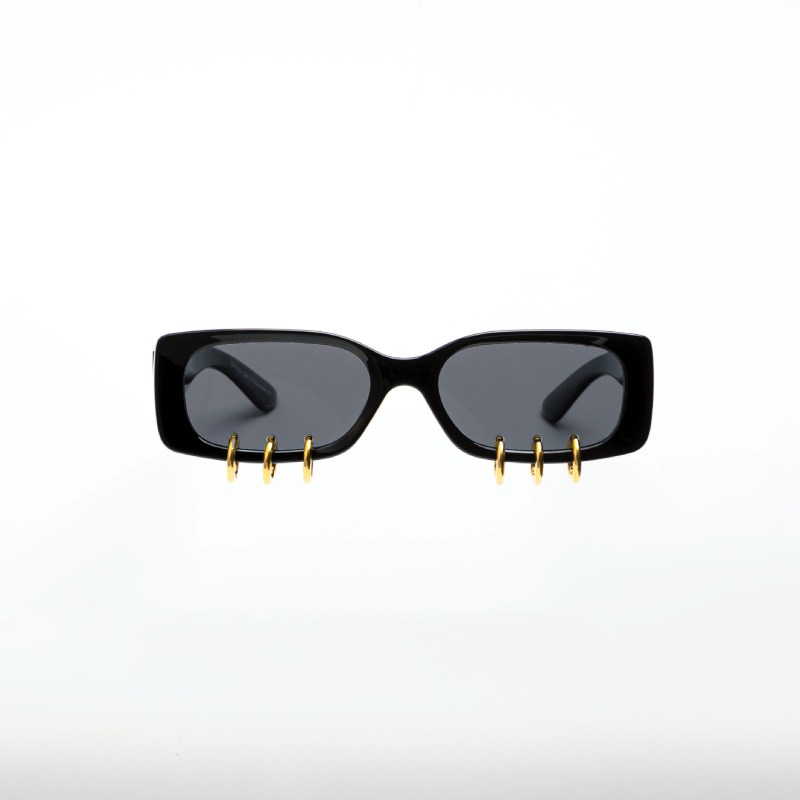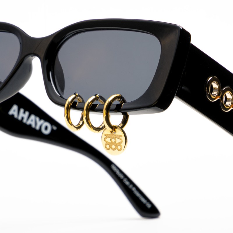 De primeras, las gafas de sol con piercings de Ahayo se ven como cualquier montura de tendencia dosmilera, pero la magia está en los cristales. Los de este modelo, tintados de gris clásico, se acentúan con tres argollas doradas en su parte inferior, dotando al modelo tan clásico de un nuevo aire urbano.