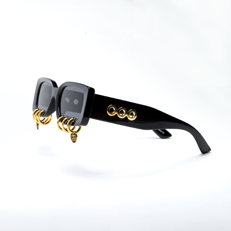 Pero esto no es todo, las gafas de sol con piercings de Ahayo también tienen un asunto en las varillas gruesas. Para rematar este look, se disponen tres ojales a los lados que cierran con broche de oro (literalmente) la construcción.