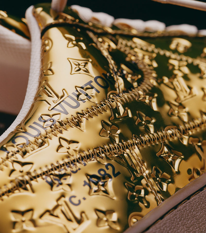 También hay un par de Air Force 1 Louis Vuitton cubierto totalmente de dorado metálico y no, no es una referencia a la foto de Paris Hilton y Kim Kardashian con dos bolsos LV Alma del mismo material: estas zapatillas doradas rinden homenaje a su primera colección como director creativo de la maison.