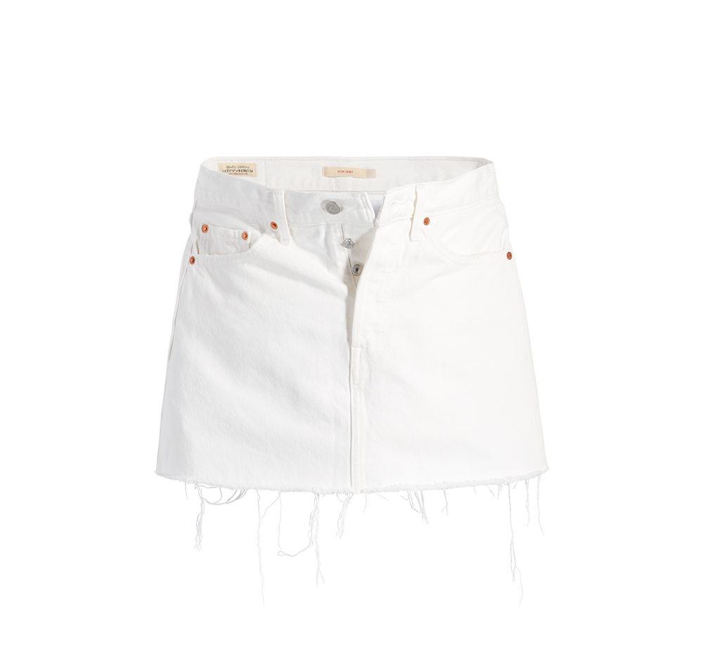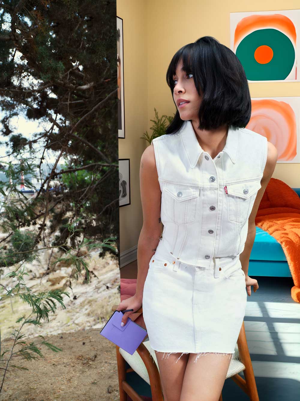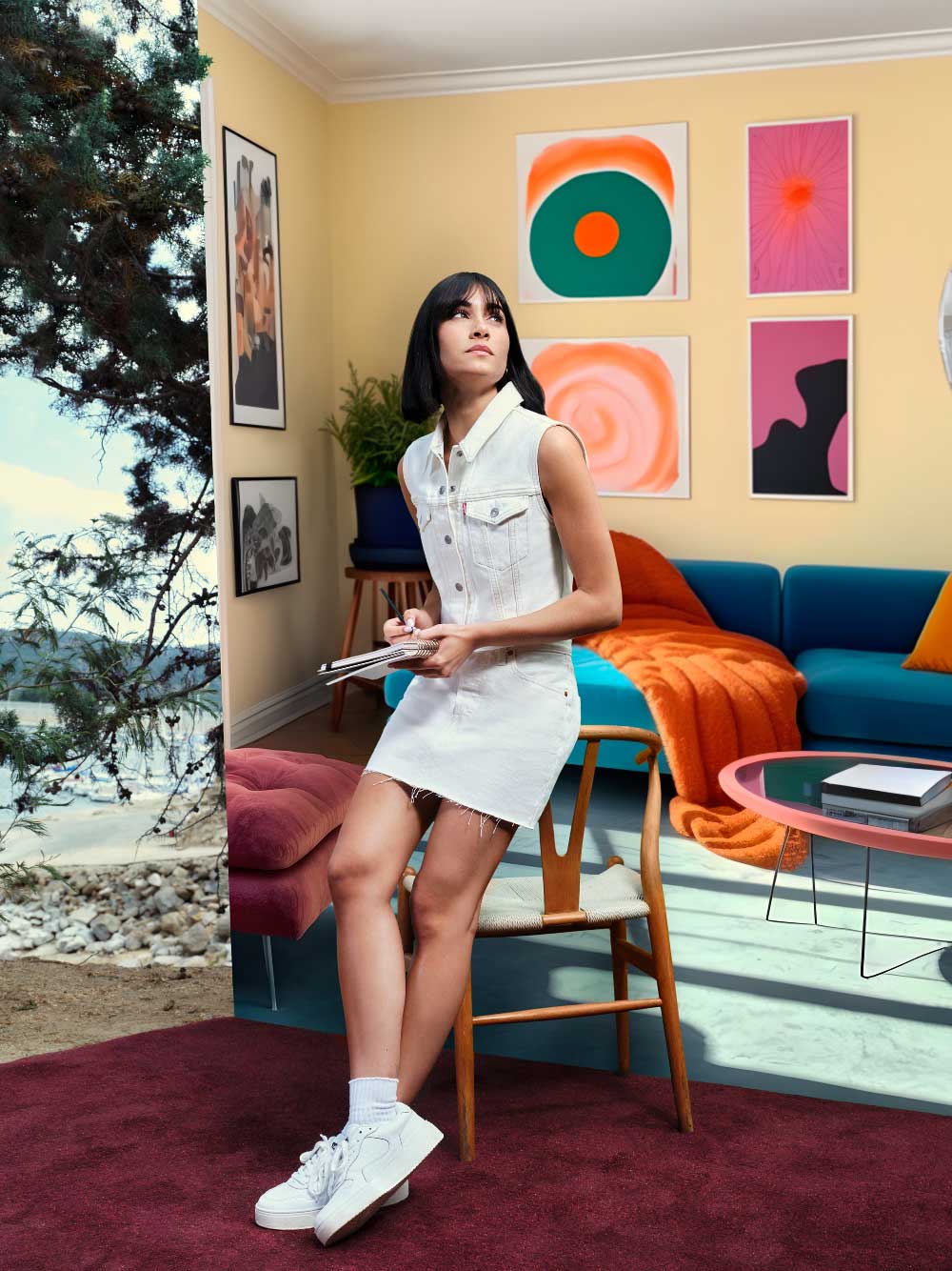 El look 1 de Levi’s se compone de: chaleco vaquero blanco, Icon Skirt del mismo tono, zapatillas blancas Gilde y calcetines sport. Encontrarás todo aquí