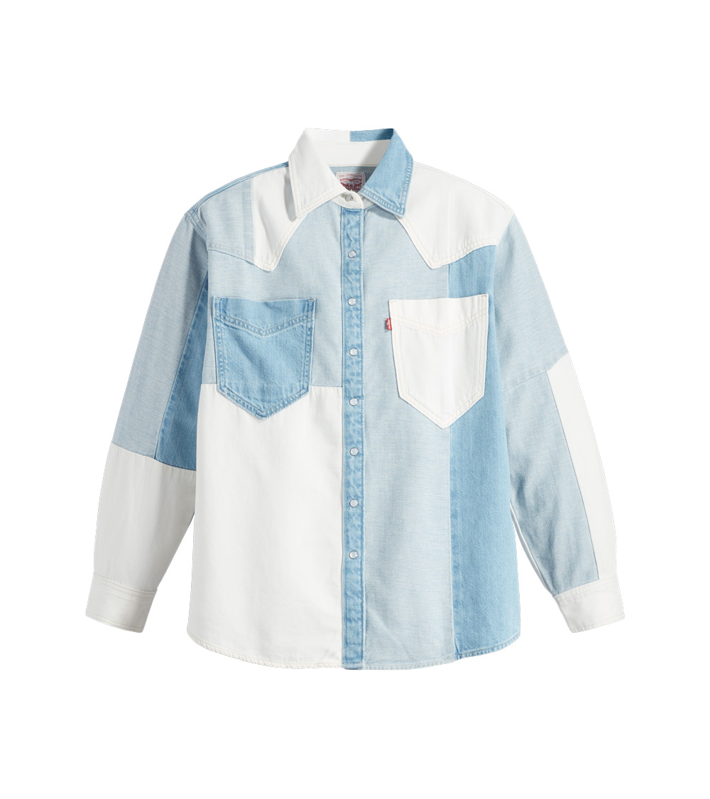 El look 3 de Levi’s se compone de: baggy trousers chinos de color beige, tank top blanco y camisa de patchwork en diferentes tonos denim, más zapatillas Stryder. Encontrarás todo aquí