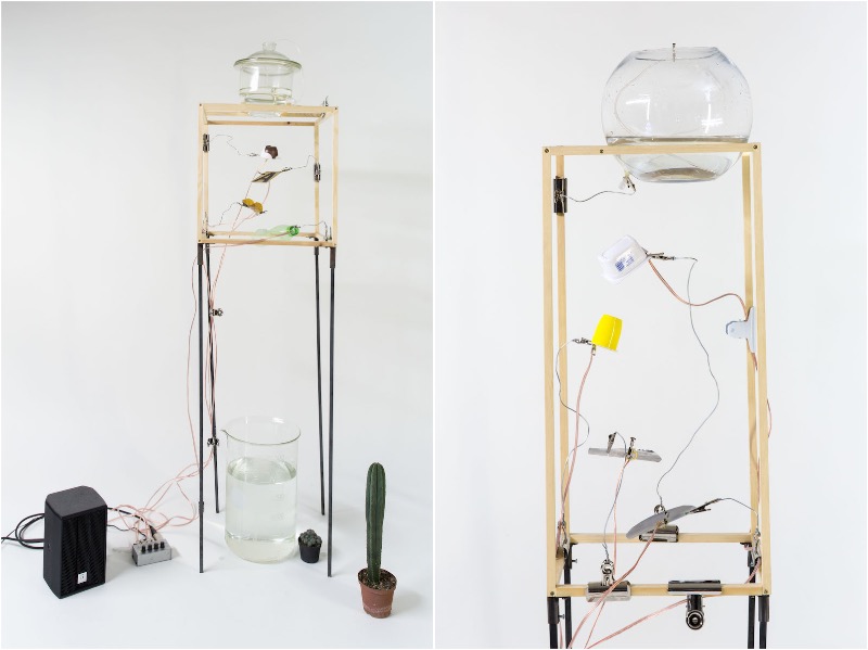 Pues, no te creas, aunque trabajo con sonido, también pienso que en mis piezas tiene que haber elementos visuales. No en el sentido sinestésico, o sea ver sonidos o escuchar colores, sino más bien me refiero a que el sonido me dicta cómo debe “construirse” la escultura. Hay componentes que deben colocarse de cierto modo, de lo contrario no funcionan. A pesar de eso, tomo muchas decisiones visuales y creo que mis esculturas sonoras están muy orientadas visualmente. Por ejemplo, pensando en mis Dripping Skulpturen (Esculturas que Gotean) y en que tengo muchos trabajos que usan agua, en especial el goteo de agua, todos son visualmente diversos e independientes unos de otros. Es decir, parten del mismo fenómeno: gotas de agua golpeando superficies y generando con ello un sonido, pero con resultados finales diferentes. También hago piezas que funcionan sin sonido: objetos, esculturas, dibujos o collages; aunque sí, las instalaciones y actuaciones son el punto de partida para todo lo demás.