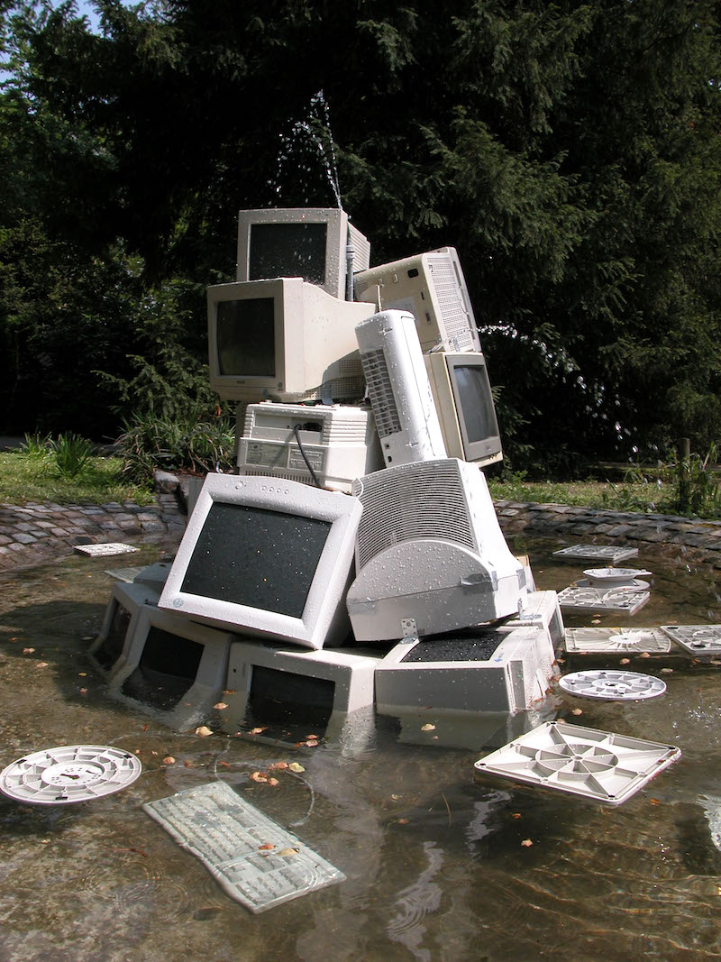 Después, construí fuentes (en plan surtidor) a partir de desechos de ordenadores y también reparé circuitos informáticos más o menos inútiles y los dispuse en formas escultóricas, todas estas piezas son sin sonido, aparte del sonido que produce la ondulación del agua. La primera superposición de ambos áreas: arte y sonido se produce con unas piezas que hice con “tablas de planchar“. Monté unidades de efectos de sonido en una tabla de planchar para poder “usarla” como un guitarra y poder posar como un guitarrista. Cuando voy a conciertos de música electroacústica, observo que en ciertos momentos parece que el intérprete del escenario esté revisando sus correos electrónicos … Por eso, cuando me invitaron a participar en una exposición, y con esa idea en mente: la de transmitir emoción al tocar y la teatralidad que debe haber en el escenario, desarrollé una instalación completa a partir de las tablas de planchar, Ironing Board Disensemble.