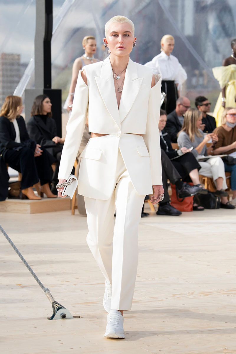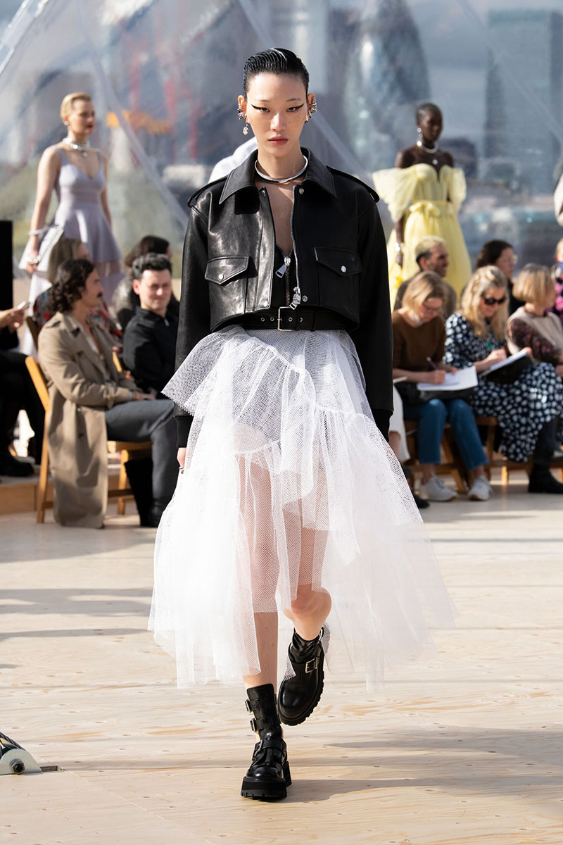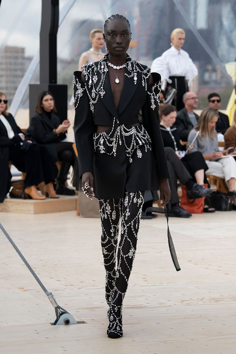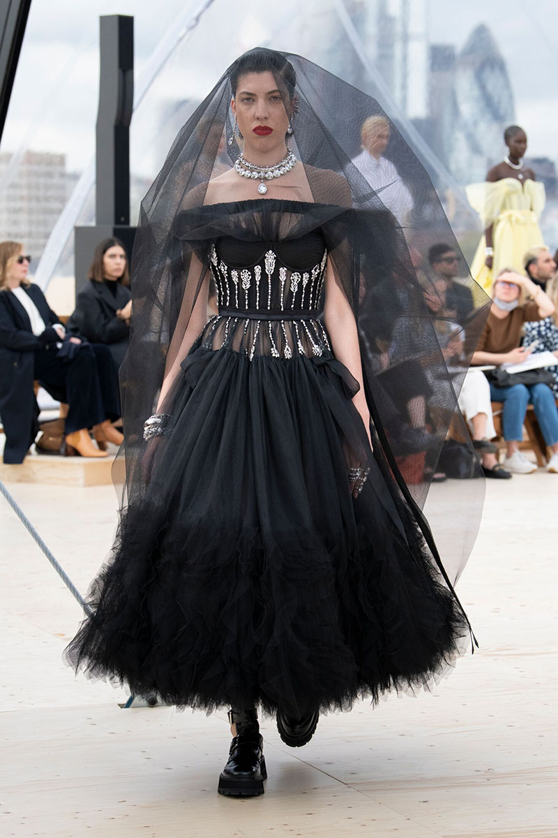 El desfile, celebrado en una interesante cúpula situada en la azotea de un aparcamiento en el East End de Londres daba aun más sentido al concepto que esconden los nuevos diseños de la colección de Alexander McQueen SS22 Womenswear. La encargada de cerrar el desfile fue la supermodelo Naomi Campbell, muy amiga de la casa, que lució uno de los conjuntos de tres piezas en negro con detalles en pedrería compuesto por un mono, una chaqueta corta y una falda de tul.