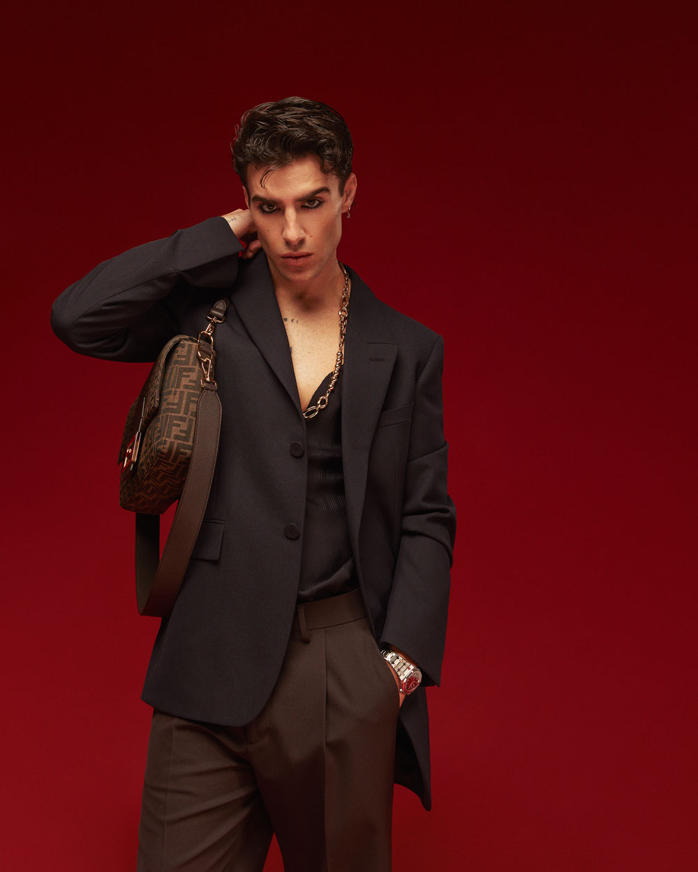 Álvaro de Luna con total look y bolso FENDI, cadena UNO DE 50, reloj AUDEMARS PIGUET Royal Oak Jumbo Extraplano y peluquería con I.C.O.N. Products: Mane Control + Allow (Pomada brillo)