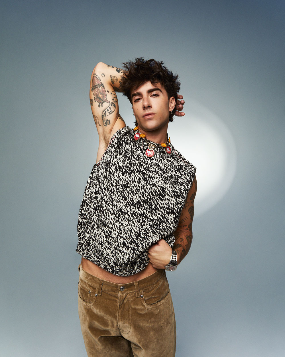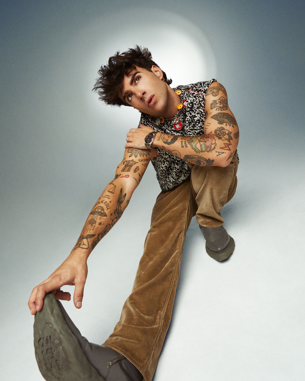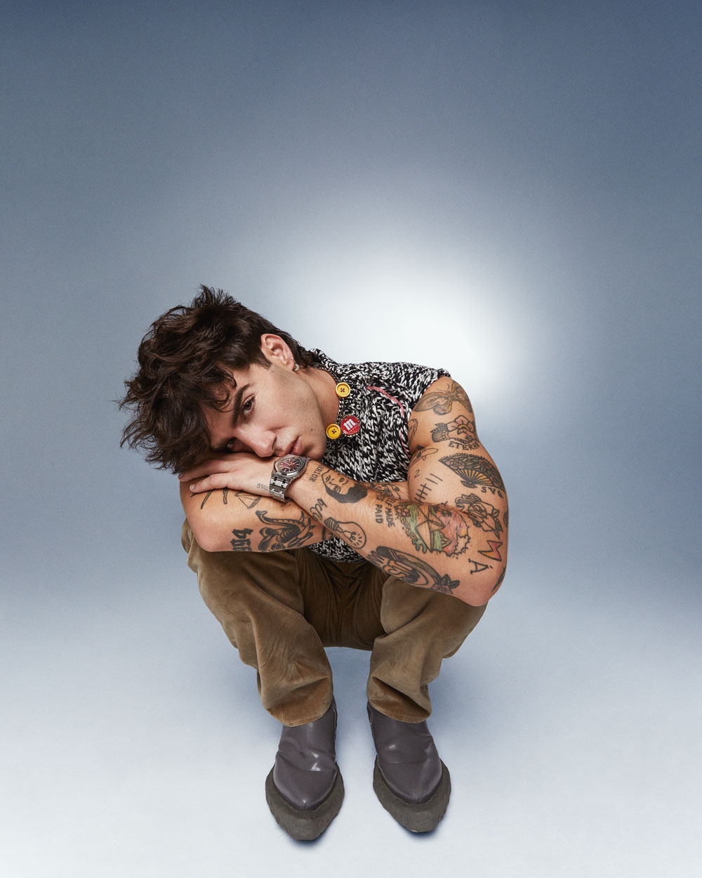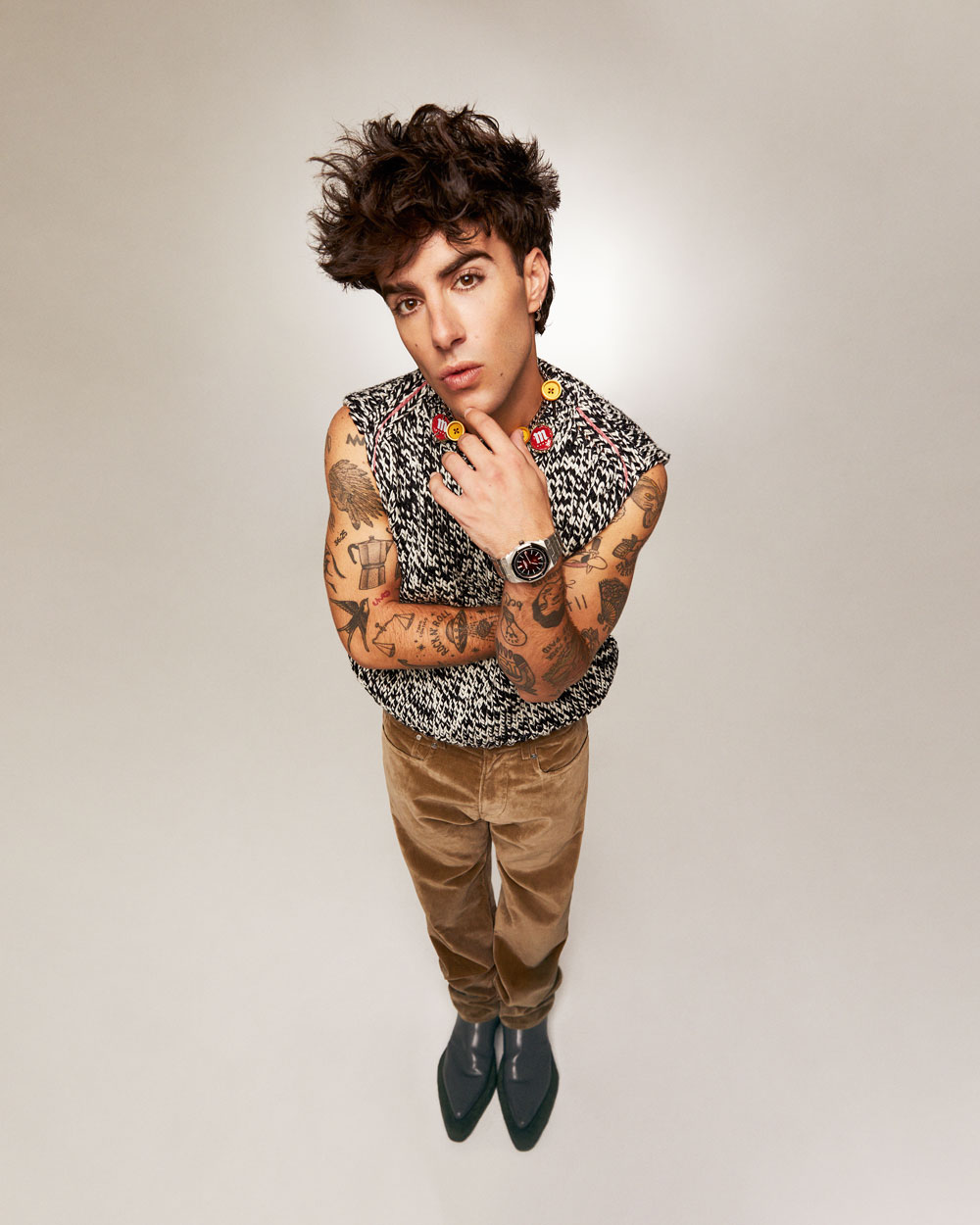 El cantante sevillano con jersey y pantalón PAUL SMITH, botas CAMPERLAB,Collar de chapas y botones JUAN VG DESIGNER, Reloj AUDEMARS PIGUET Royal Oak Jumbo Extraplano / Peluquería con I.C.O.N. Products: Beach Spray + Whip (cera demi mate)