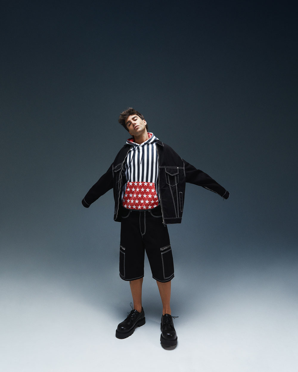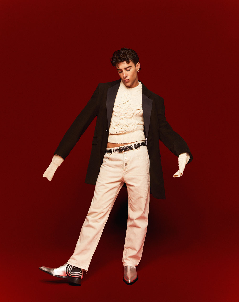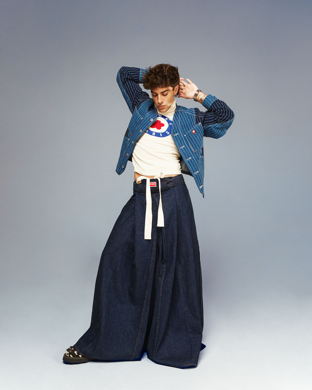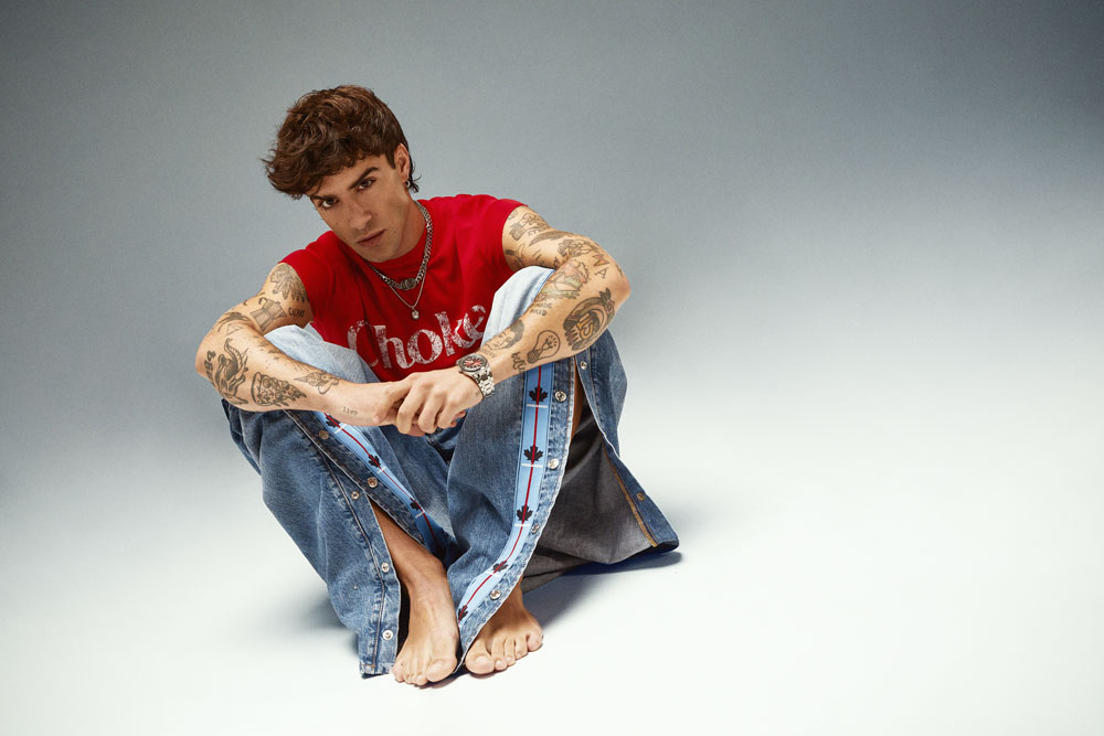 El cantante sevillano con jersey y pantalón PAUL SMITH, botas CAMPERLAB,Collar de chapas y botones JUAN VG DESIGNER, Reloj AUDEMARS PIGUET Royal Oak Jumbo Extraplano / Peluquería con I.C.O.N. Products: Beach Spray + Whip (cera demi mate)