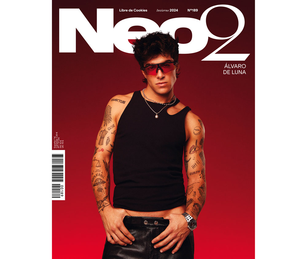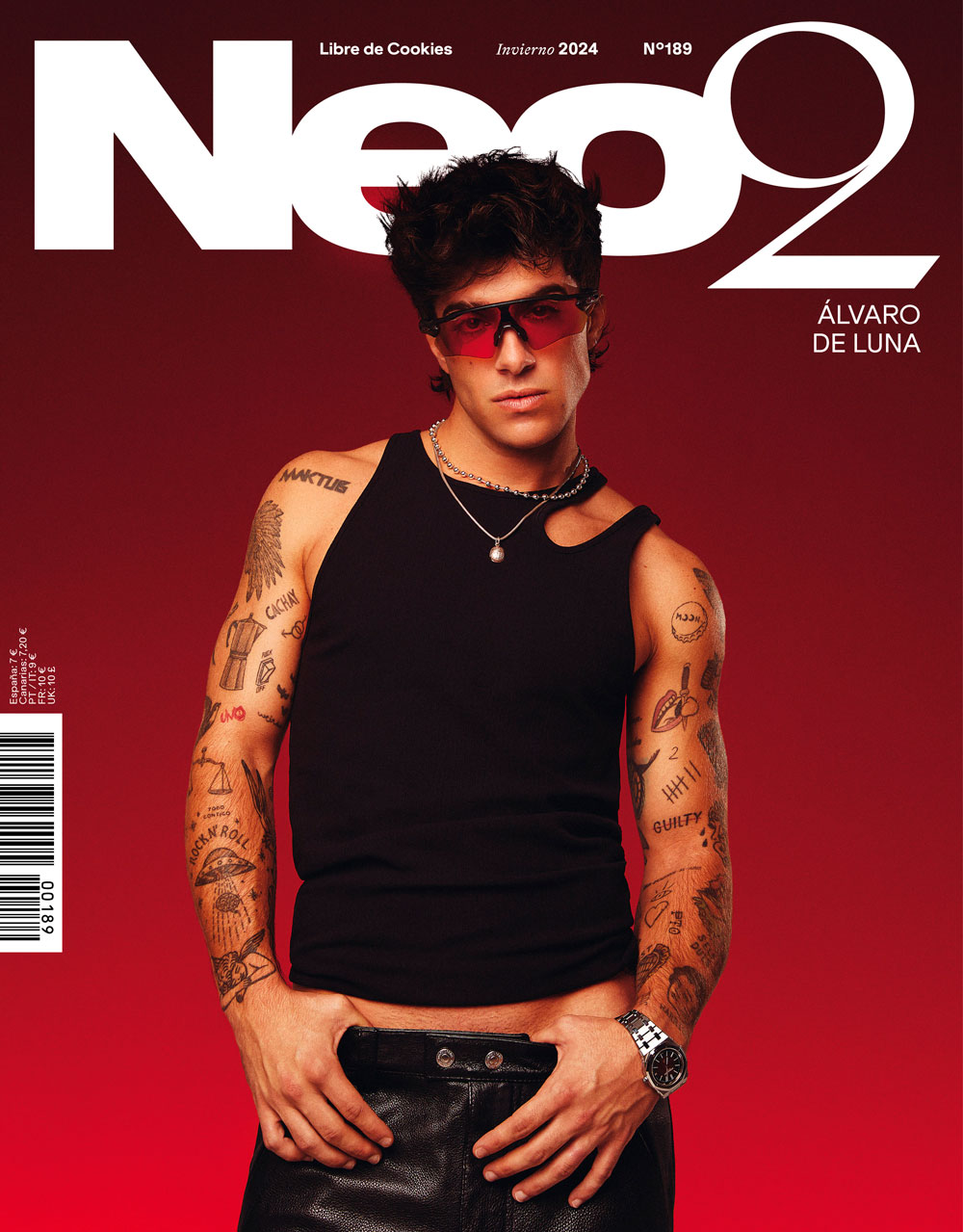En portada de la revista Neo2, Álvaro de Luna con camiseta BERSHKA + Pantalón de cuero DSQUARED2 + Collares PANDORA + Gafas OAKLEY + Reloj AUDEMARS PIGUET Royal Oak / Peluquería con I.C.O.N. Products: Beachy Spray + Whip (Cera demi mate)