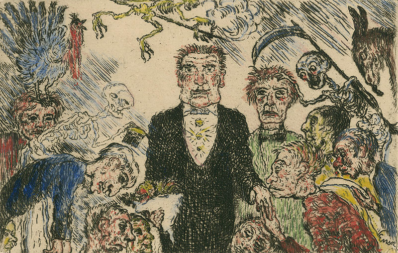 James Ensor (Ostende, 1860-1949), pintor y grabador belga, destacó por su estilo único, impregnado de una atmósfera macabra y satírica que rompía con las normas artísticas de su tiempo. Inicialmente centrado en paisajes y escenas cotidianas, su obra fue evolucionando hacia temas simbólicos cargados de ironía y surrealismo. Ensor se mantuvo alejado de los círculos artísticos convencionales y su estilo, entre el impresionismo y el simbolismo con colores vivos, anticipó movimientos como el expresionismo.