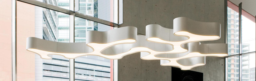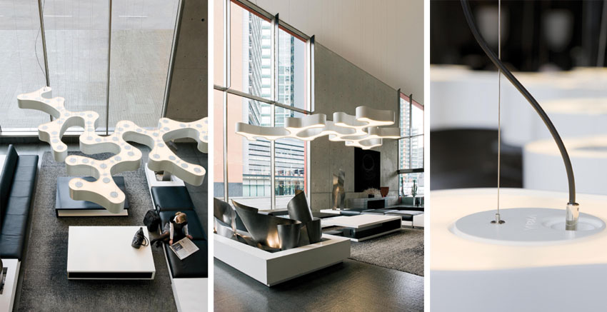 Ameba es una lámpara de suspensión perfecta para grandes espacios. Es un nuevo concepto de lámpara ya que está creada con 5 módulos diferentes que se pueden mezclar entre ellos y generar a su vez infinitas composiciones. Puedes formar desde una luminaria de 30×50 cms a una de más de 10 metros dependiendo de tus necesidades. Ha sido diseñada por Pet Sans y es perfecta para proyectos contract. Producida por Vibia.