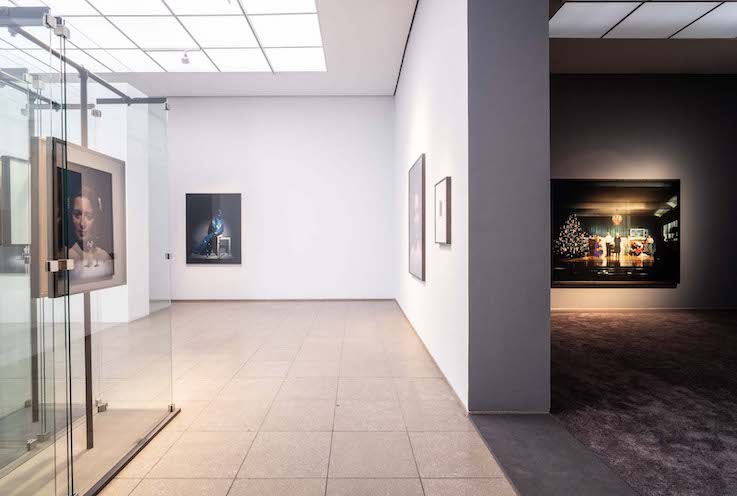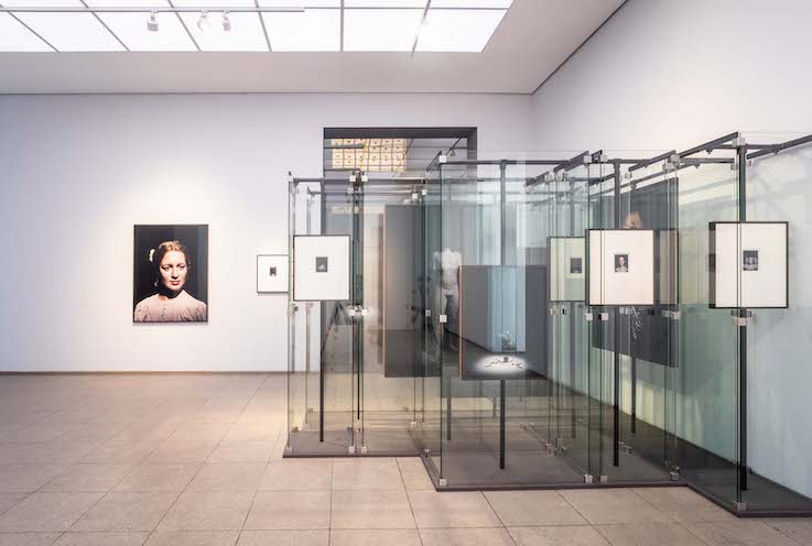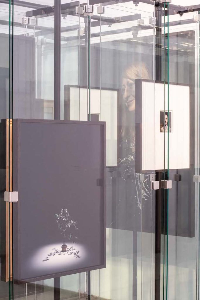 Finalizando el recorrido —a modo inverso— por la entrada a la exposición, Andreas Mühe nos introduce a su mundo a través de un dispositivo realizado con grandes paneles transparentes a modo de cabinetes que muestran fotografías de diferentes tamaños: una cabeza en primer plano, un interior con un árbol o un maniquí desnudo con las características de su padre.
