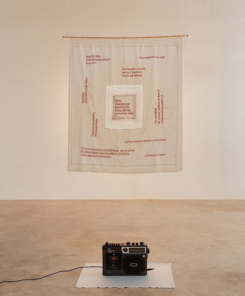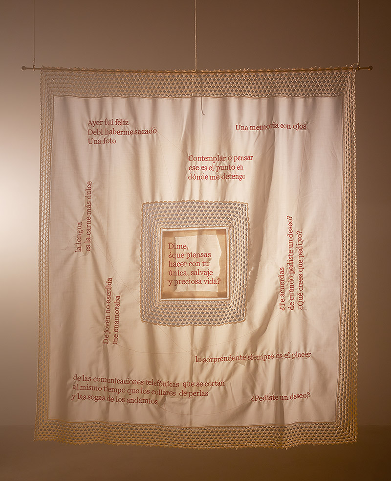 El elemento textil de la exposición, Memorias Bordadas, presenta bordados en serif Baskerville rojo sobre tela encontrada, mostrando fragmentos de escritores rioplatenses como Pizarnik, Vilariño y Hernández.